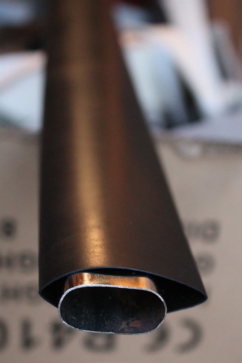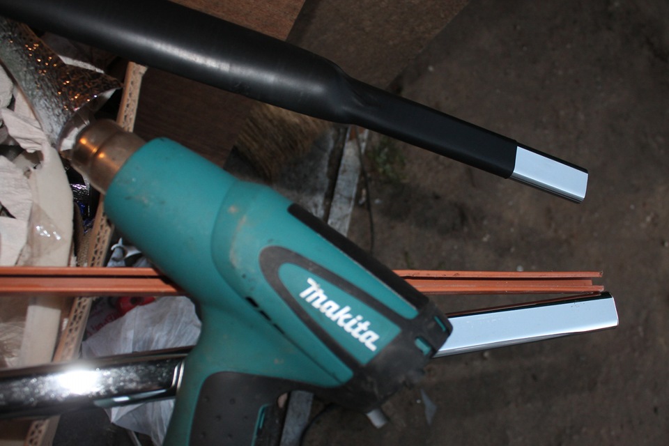 Потом на необтянутый край трубы одеваем еще небольшой кусочек встык с запасом по краю. После прогрева свободный край сам заворачивается вовнутрь. Стык термоусадки обматываем черной изолентой. Не очень эстетично, но на скорость не влияет. Конечно в идеале было бы использовать цельные куски, но я не нашел.