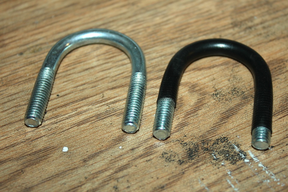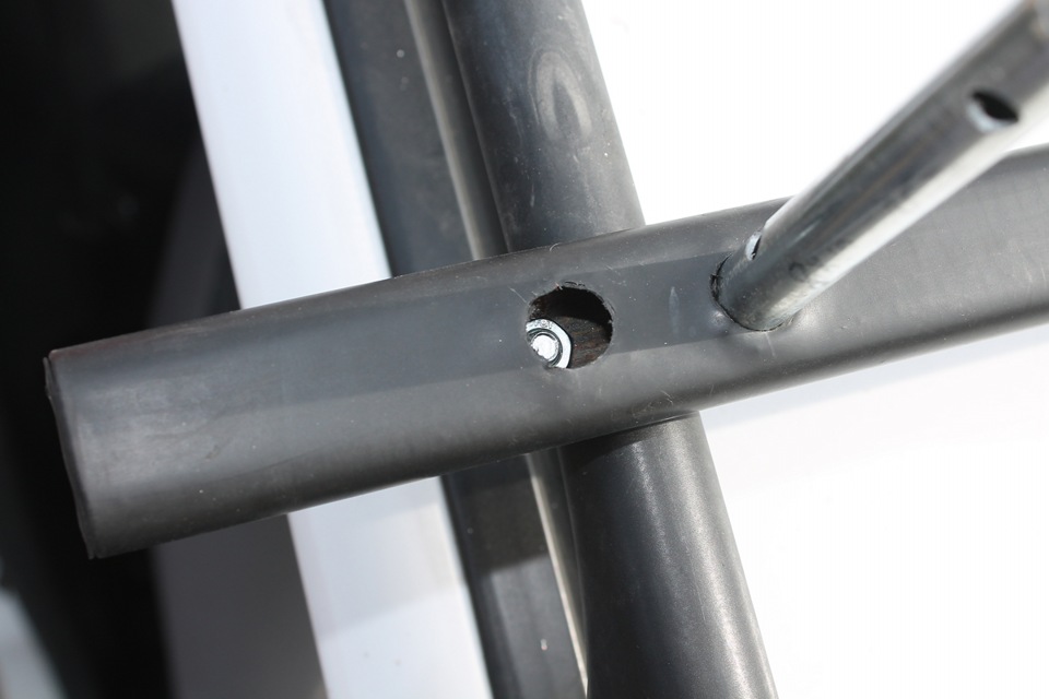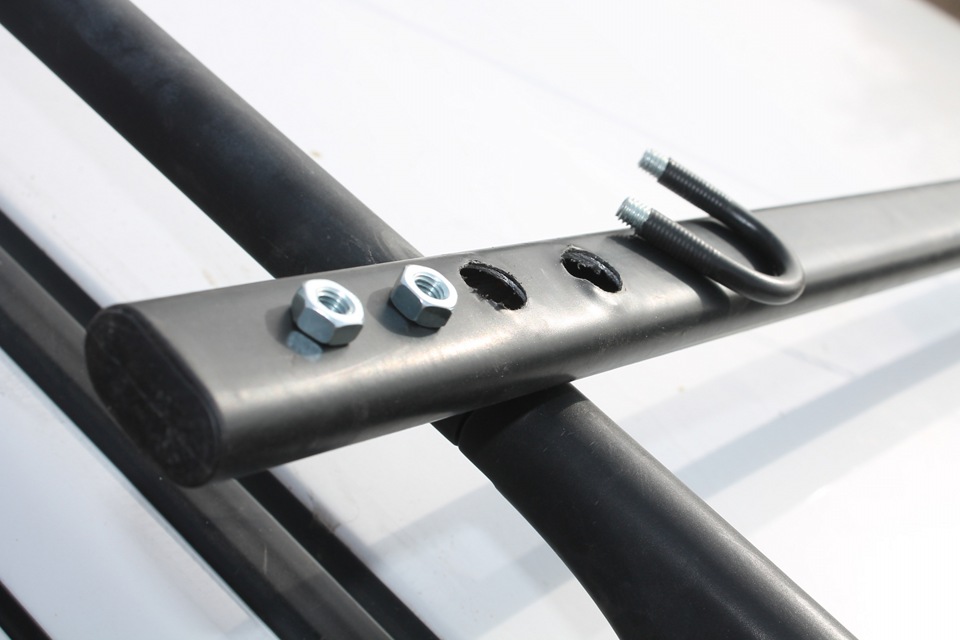 Для крепления поперечин к рейлингам использовал U- образные скобы d25 мм, которые тоже обтянул термоусадкой. По месту размечаем места будущих отверстий. Сначала насквозь сверлим сверлом d8 мм, потом с одной из сторон рассверливаем до 14 мм. Через эти отверстия будет проходить торцевой ключ для затяжки гаек.