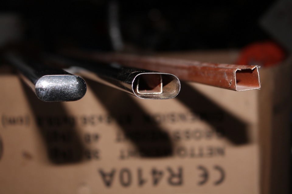 На мебельной оптовке куплен 3-х метровый хлыст хромированной трубы овальной формы (из нее делают поперечины в шкафы для одежды) и боковые овальные заглушки. Из кладовки извлечен хлыст направляюшего карниза для тюли. В магазине крепежа приобретены U-образные резьбовые стяжки и пластиковые затычки. Сложнее всего было достать термоусадочную трубку большого диаметра. Объехал все магазины электротехнических материалов- нигде нет. Нашел на радиорынке у какого-то дедка:)