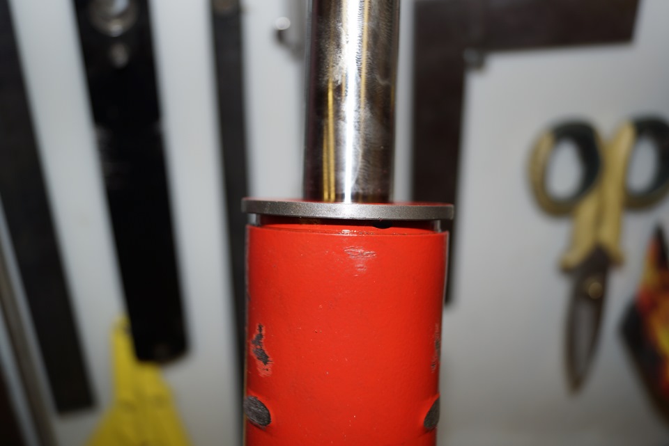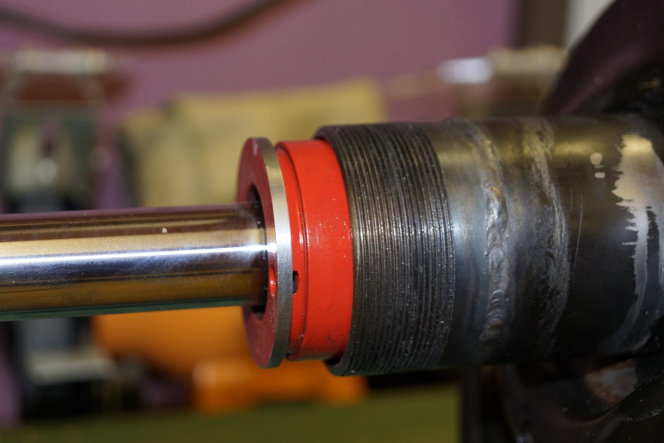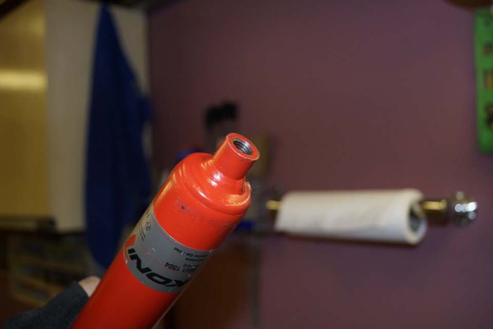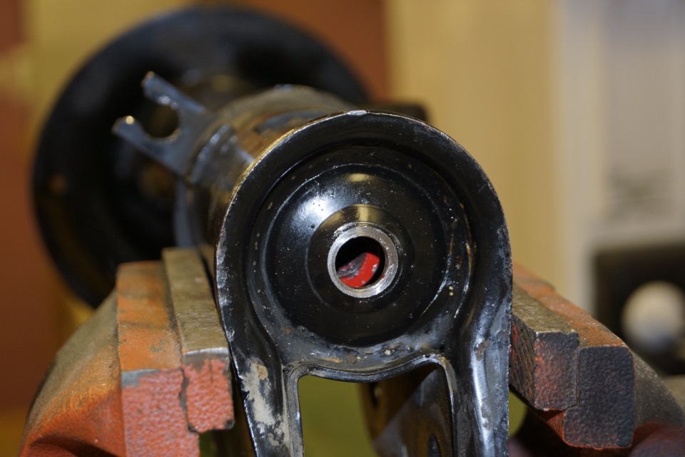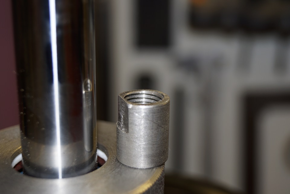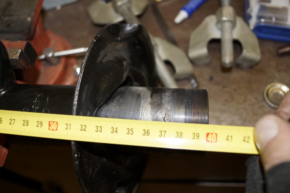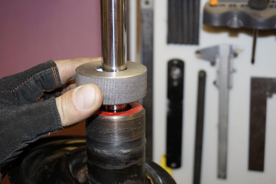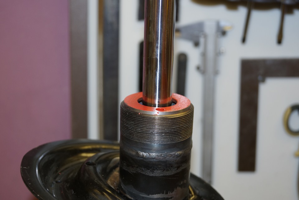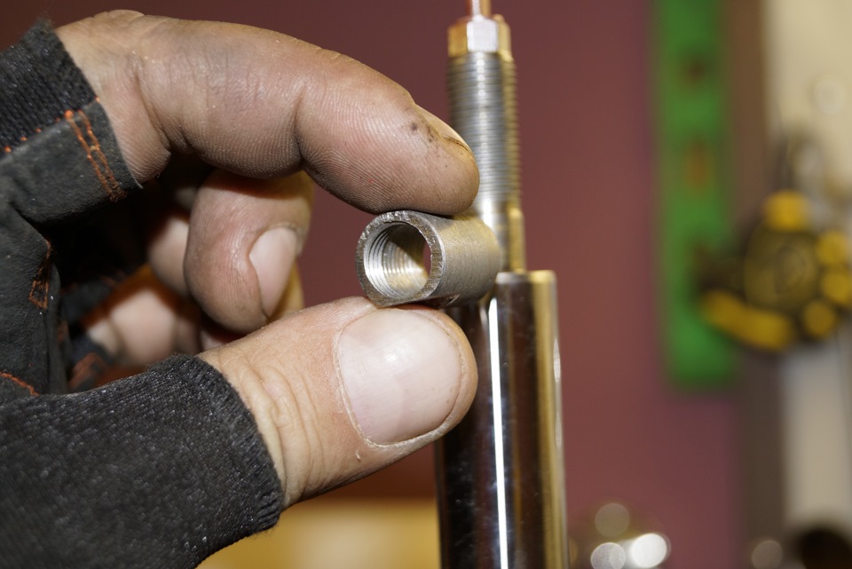 Ещё и сама резьба штока отличается от штатной, ребята на форуме просто предлагают выточить втулку с фаской и одеть, но из учёта того что стуков и бряков и так у нас хватает, мы во втулке нарезали резьбу и зафиксировали фиксатором для резьбы средней фиксации (синий), впрочем я и гайку и нижний болт тоже посадил на фиксатор.