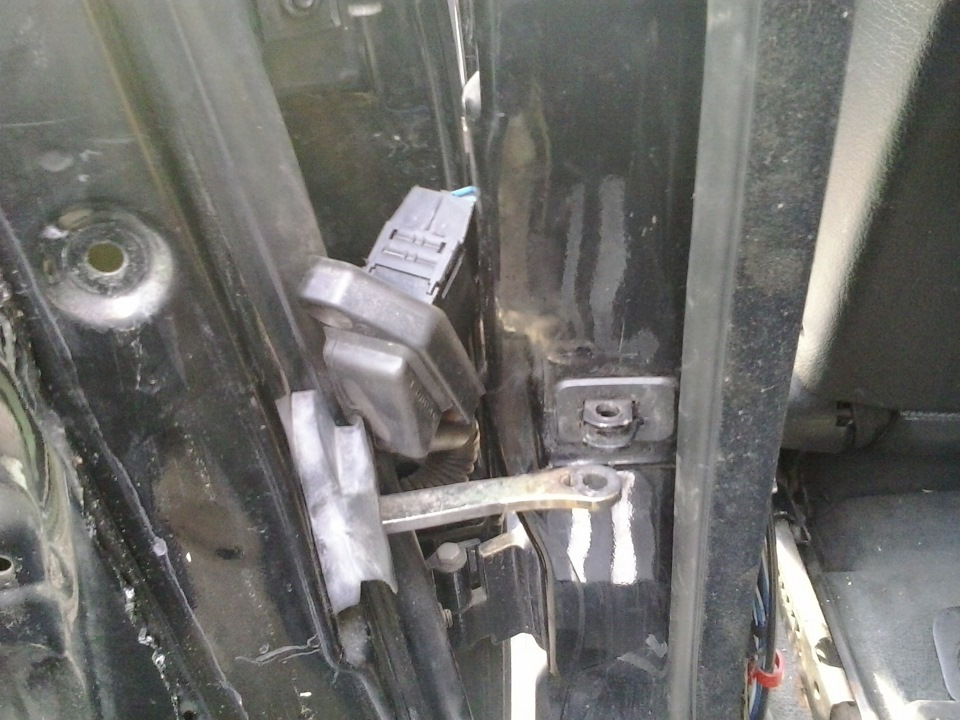 Теперь можно заняться проводкой. Советую для начала снять внутреннюю обшивку стойки. Приступим к демонтажу старой проводки (сняв обшивку двери, скорее всего у себя вы увидите скромную дверную проводку в виде 3-х проводов, идущих под ЦЗ), для чего отсоединяем фишку с ЦЗ. Фишка там с фиксатором, что бы снять ее нужно черный фиксатор опустить вниз и потянуть фишку на себя. Теперь главное отсоединить эту дверную проводку и извлечь ее. Тут я столкнулся с некоторыми трудностями, т.к. просто отсоединить фишку, которая в стойке не смог, нужно сначала достать разъем наружу (в сторону улицы). Но тут мешает дверь. Отсоединив ограничитель двери, кое-как удается этот разъем вытянусь и разъединить (установку новой проводки производим так же, заводим проводку в дверь, соединяем разъем, и только потом пытаемся его в сборе установить обратно в стойку).