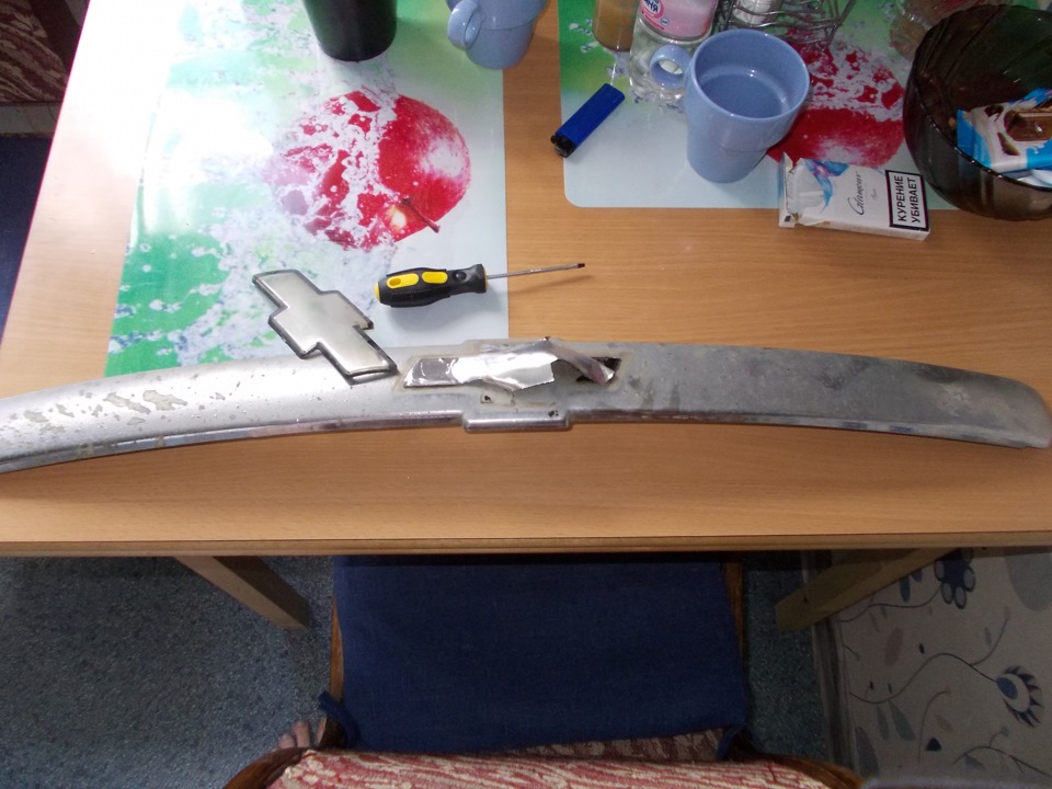 Между делом, давно хотел что то сделать с хромированной накладкой на решетке радиатора — хром на ней весь облупился, выглядит убито. Решил что можно ее снять, шлифануть и затянуть в пленку под хром.