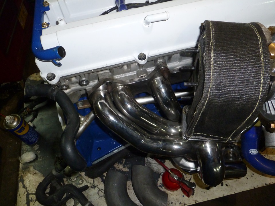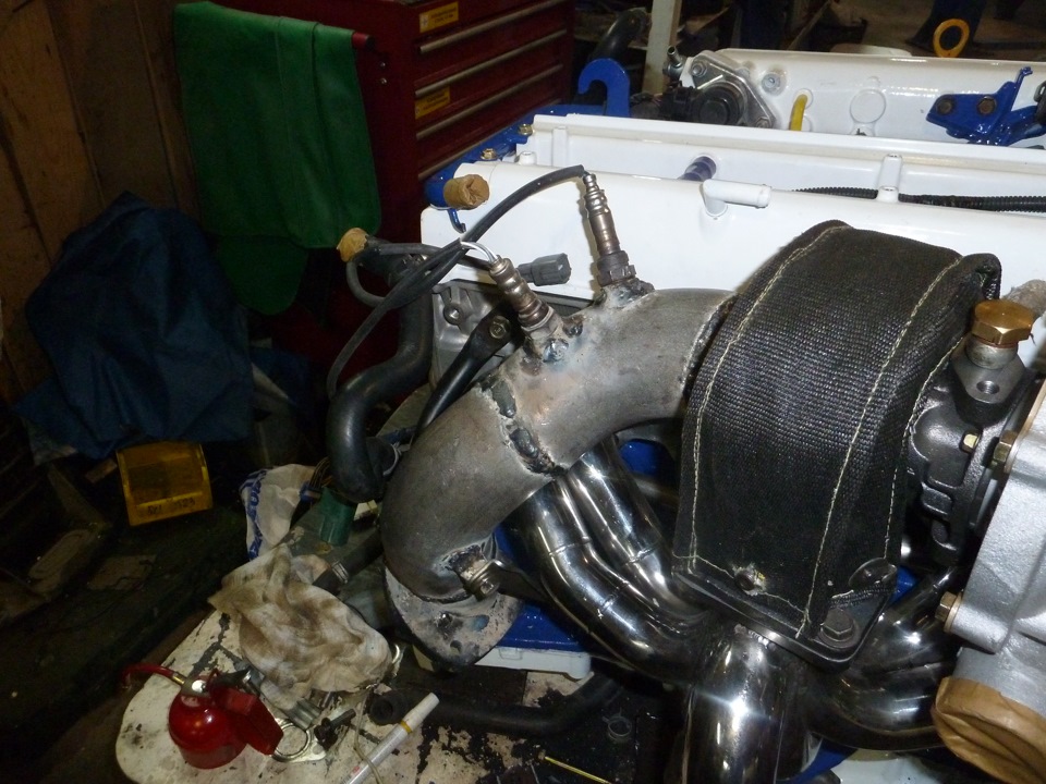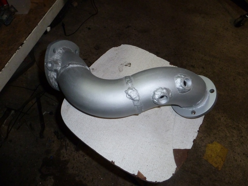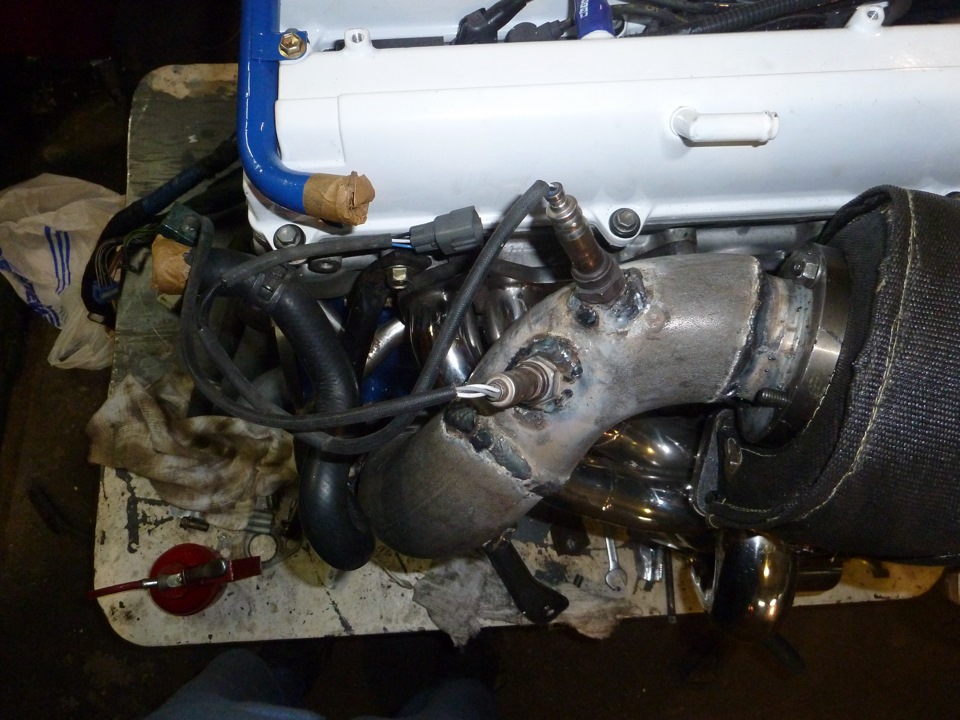 Ставим коллектор и турбину на место — необходимо вымерить и изготовить трубу-аутлет от турбины диаметром 76мм, распорки под коллектор, аутлет и вестгейт. Не забываем в аутлете сделать отверстия и приварить втулки с резьбой М18*1,5 для датчика кислорода и широкополосную лямбду. Кстати, решил отказаться от родного туриковского датчика кислорода с креплением двумя болтами в пользу более универсального и удобного датчика от атмо джея с резьбой по центру. Получилось как-то так=))