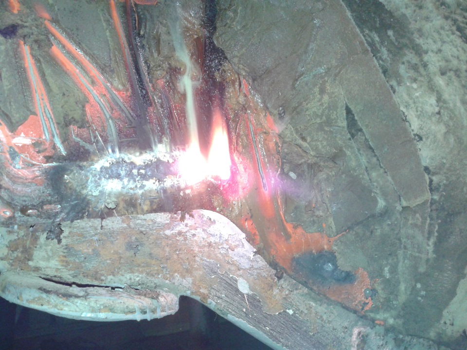 Сняли 5ую дверь. Обнаружилось, что за резинкой уплотнителем ржавчина начала появляться — будем устранять. И неприятное событие — пожар маленький, так сказать возгорание от сварки. Загорелось покрытие в арке. Приходилось сидеть возле и сбивать возникающее пламя.