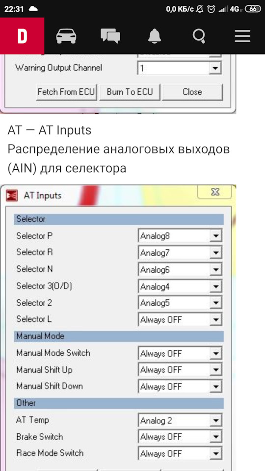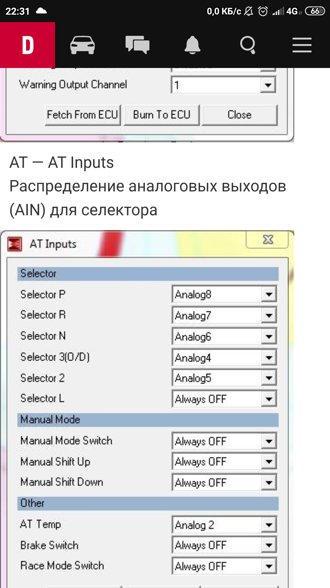 привет. Я тут тоже себе такую приблуду ставлю на коробку. И вот никак не могу ее в дело пустить. Не переключает передачи, едет на одной все время. И положение 2 и L не реагирует, вывел их на AIN4 и AIN5. Как я понял, это аналоговые входы в меню AT Inputs. Но как их активировать? в меню Inputs pullups переводил их в pulldawn, ничего не изменилось. Можешь подсказать? А то я уже башку всю сломал. Коробка на дизеле стоит, поэтому от него сигнал тока от дросселя идет. больше никакких