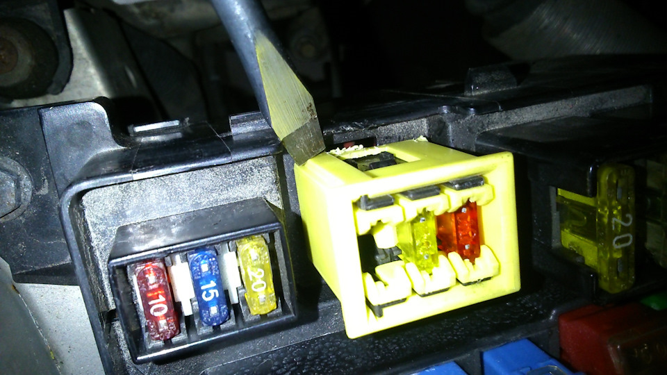 Достал так — подтолкнул снизу плоской отвёрткой, после чего эта конструкция поднялась до следующего фиксатора. Потом с горем напополам и с большим усилием тянул жёлтую коробку вверх и подталкивал отвёрткой с другой стороны чтобы и на другой стороне фиксатор освободить, почти отломав кусочек жёлтой штуки смог достать предохранители. Предохранители выдавил оттуда плоской отвёрткой и поставил новые. Надо быть аккуратным и не давить сильно на саму коробку предохранителей.