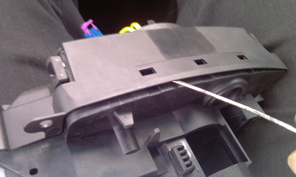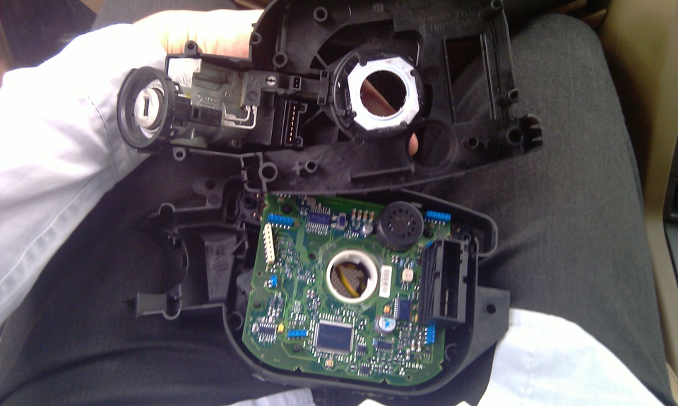 Откладываем крышку с замком зажигания и ныряем еще глубже — аккуратно приподымаем плату. Подрулевые переключатели практически сами вываливаются: