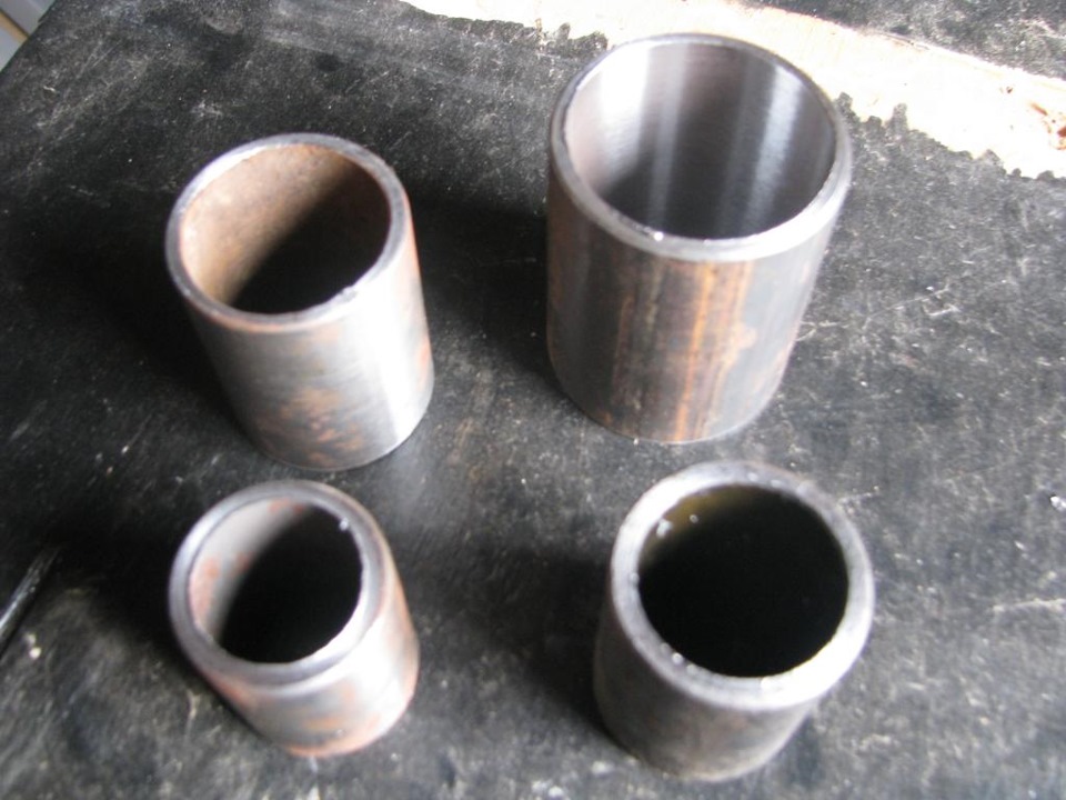 Все оправки для запрессовки были сделаны из труб используемых в газовом хозяйстве, некоторые оттачивались на токарном станке. На фото, оправки для больших сайлентблоков, еще без пропилов под пластину.