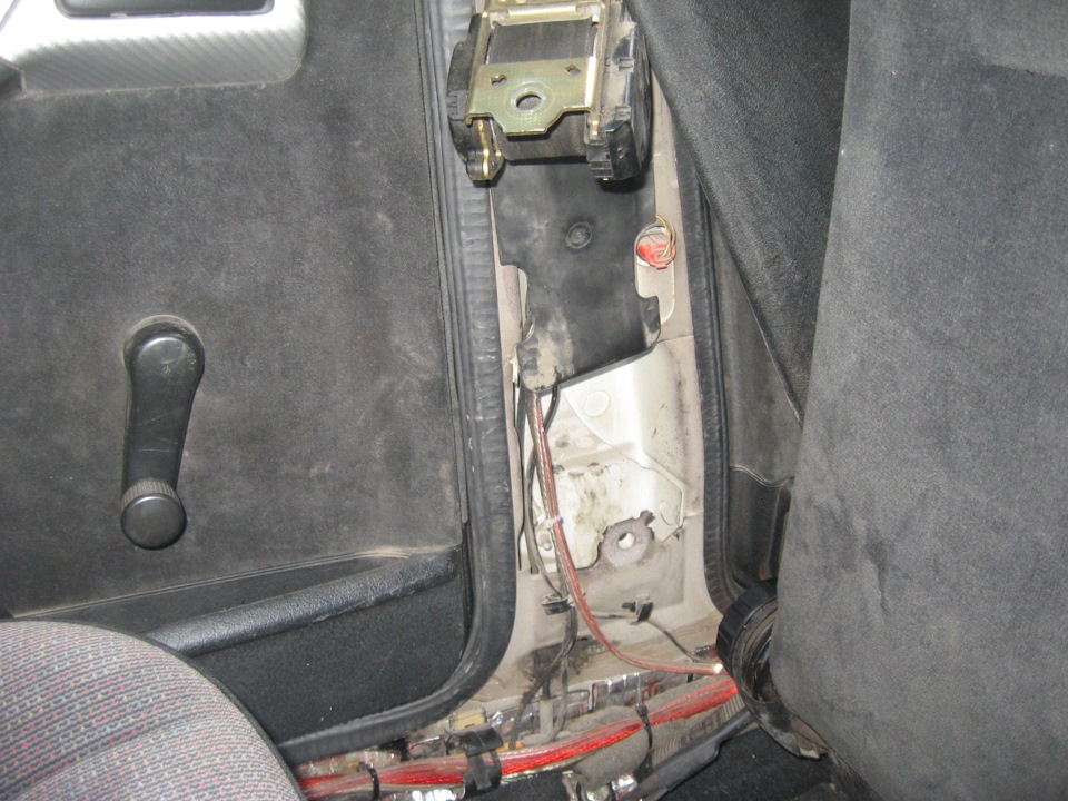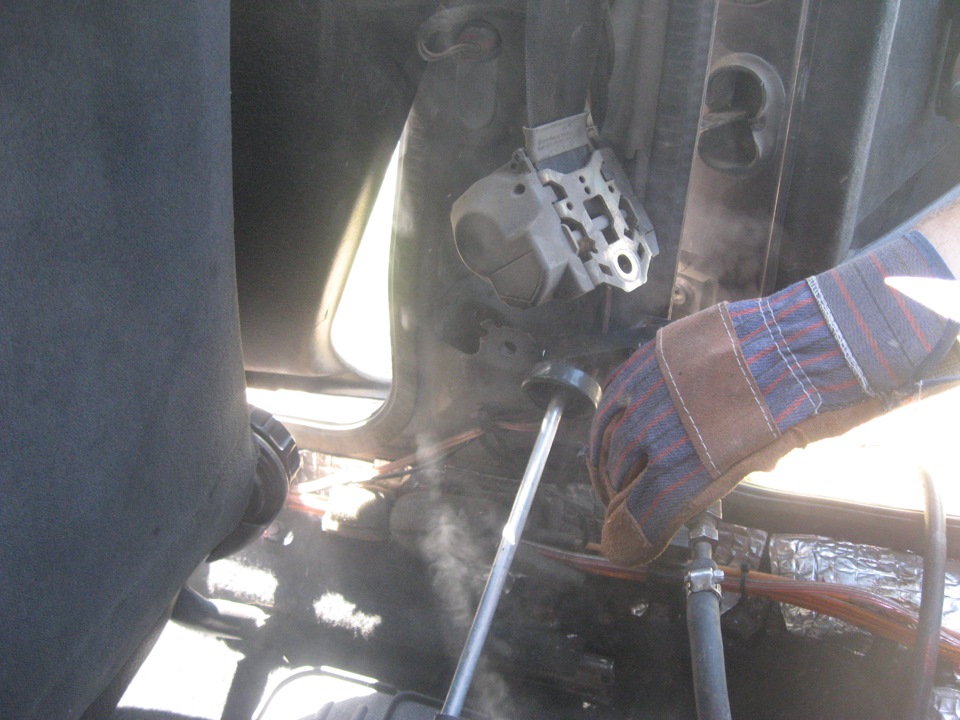 Далее разбираем область в районе ремня безопасности… снимаем механих ремня… и вставляем пистолет в отверстие… и жмем курок))) Давление такое, что порог пробивает от начала до конца…
