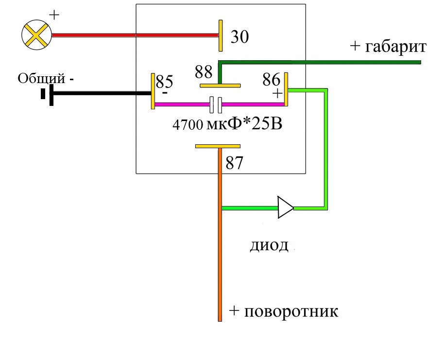Привествую. Грамотно сделано! Хотел бы так же но что я запутался (т.к. профан в этом)… Если с массой и + от габаритов и поворотника вроде все ясно… А постоянный +, (тот что на схеме к 30 ноге на реле идет) куда подпитать? По фоткам видно что красный (т.е. розовый) что на 30 — подключен к + от габаритов, а тогда зеленый (что + к габаритам) куда? (((