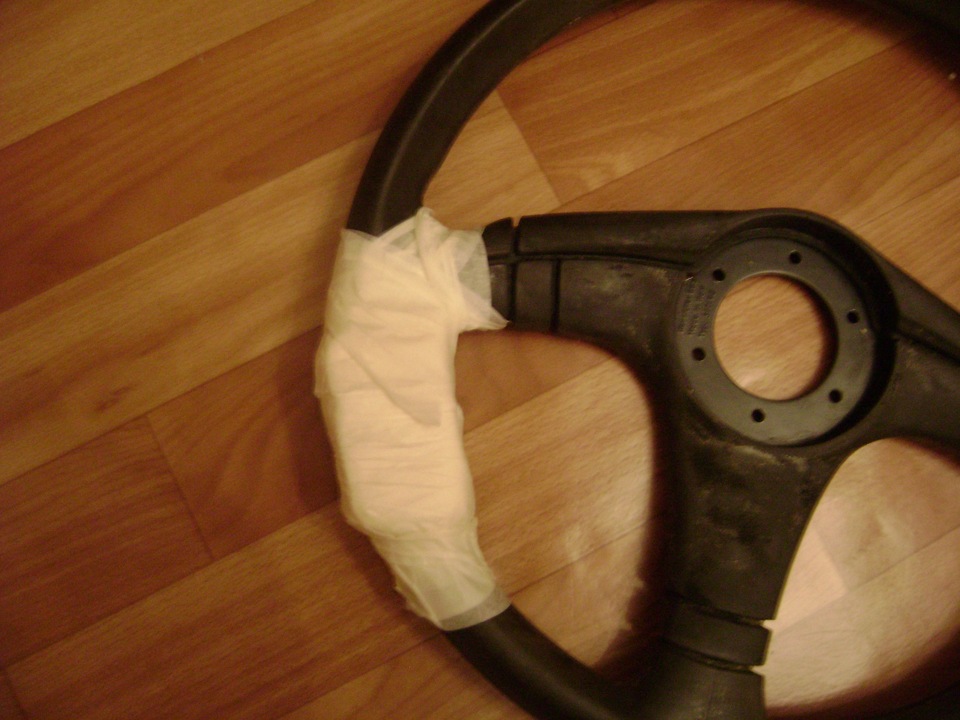 Сначала вырезал в руле более удобную форму для вставки и немного поснимал остатки старого клея и кожи.