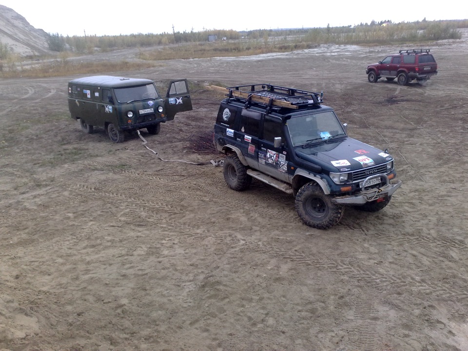 Пришло время старта, выстроились, наконец старт — и УАЗ глохнет прям на старте, стыд и позор. Кое-как завелся, поехал за всем, благо особо много времени не потеряли, первая точка на горке и общая, все столпились перед горкой, лихо заезжают. Ну и я следом за ними. А вот фиг — без пониженной не едет, не хватает! Скатываюсь вниз, пробую по-разному с разгона — не едет. Включаю пониженную кое-как с матами (снизу ведь все), еду — едет, но на 3/4 подъема выбивает пониженную. Твою ж налево! Раза три пробовал — выбивает и все тут. Все соперники уже давно уехали, одни мы как дураки остались. Поехали на гонку блин) На первом СУ еще к тому же помощь запрещена, т.е. заехать надо по-любому самому. Сходить обидно сразу же, да и не серьезно это. Вспомнил видеоролик клуба Алтай4х4, решил попробовать задом на пониженной. При езде задом пониженную не выбивает, но заднюю выбивает. Заднюю можно держать, разгоняюсь, держа рукой рычаг еду. Заехал! Столько приключений с самого начала, не к добру это, подумал я.