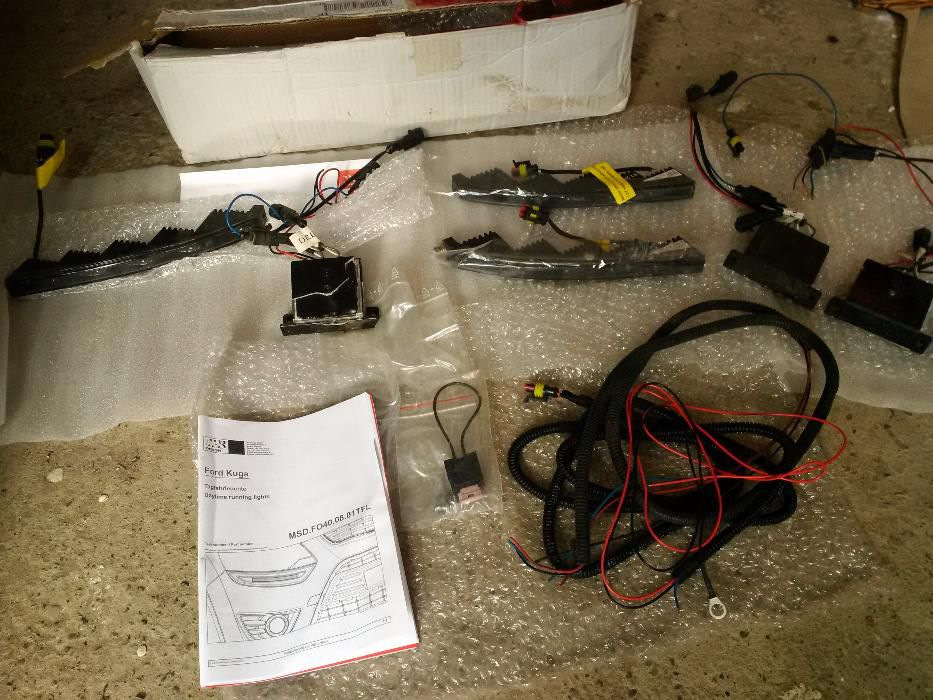 Тут же в машине все распечатал — в коробке лежит новый установочный комплект DRL огней на Кугу!