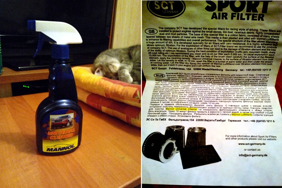 По поводу моющего средства: оно универсальное автомобильное, но производитель фильтров почему-то именно его и рекомендует. Производителю виднее, хотя я лично думаю, что для промывки нулевика вполне подошло бы совершенно любое жирорастворяющее моющее средство. Тот же "мистер мускул" или "фейри". Но это если бы не было рекомендуемого.