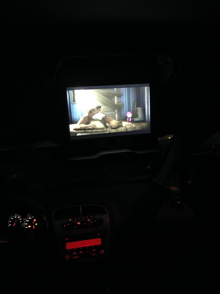 Монитор хороших размеров (7"), имеет аудио-видео вход интегрированный в подлокотник (подключай что хочешь), а также вывод звука как на штатную аудио-систему, так и на беспроводные наушники.