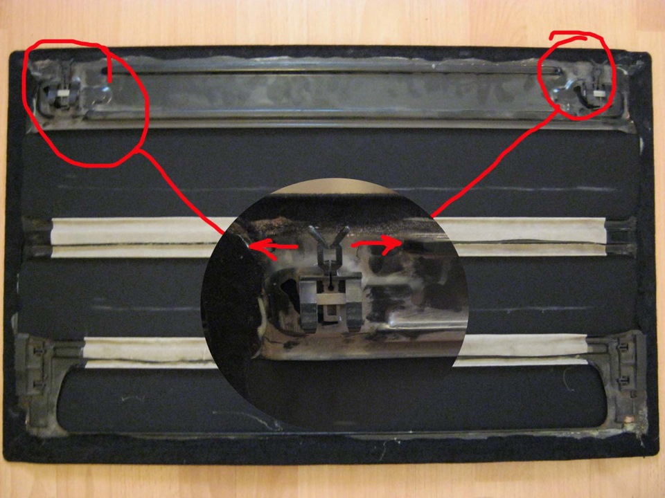 Чтобы снять обшивку нужно открыть люк где то на половину, просунуть руку между металлической крышкой и обшивкой и нащупать по краям клипсы. Вот поближе на снятой обшивке чтобы было понятнее. Развести усики в стороны и толкнуть обшивку от себя. Затем закрыть люк и достать из салона обшивку. Оказывается все элементарно.