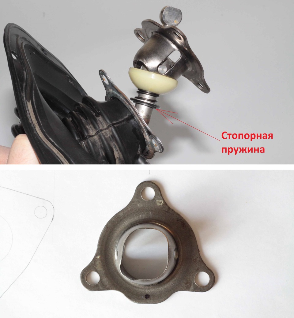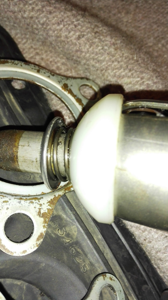 Внутри колокольчика должен быть пластиковый шарик. Отдаленно напоминает сустав человека. Однако помимо шарика я обнаружил смещение фиксирующей втулки и повреждение самого колокольчика. Тут кто то уже был и явно руко*опый (криворукий). Авто без ДТП, но колокол из 2мм стали поврежден не простым переключением.