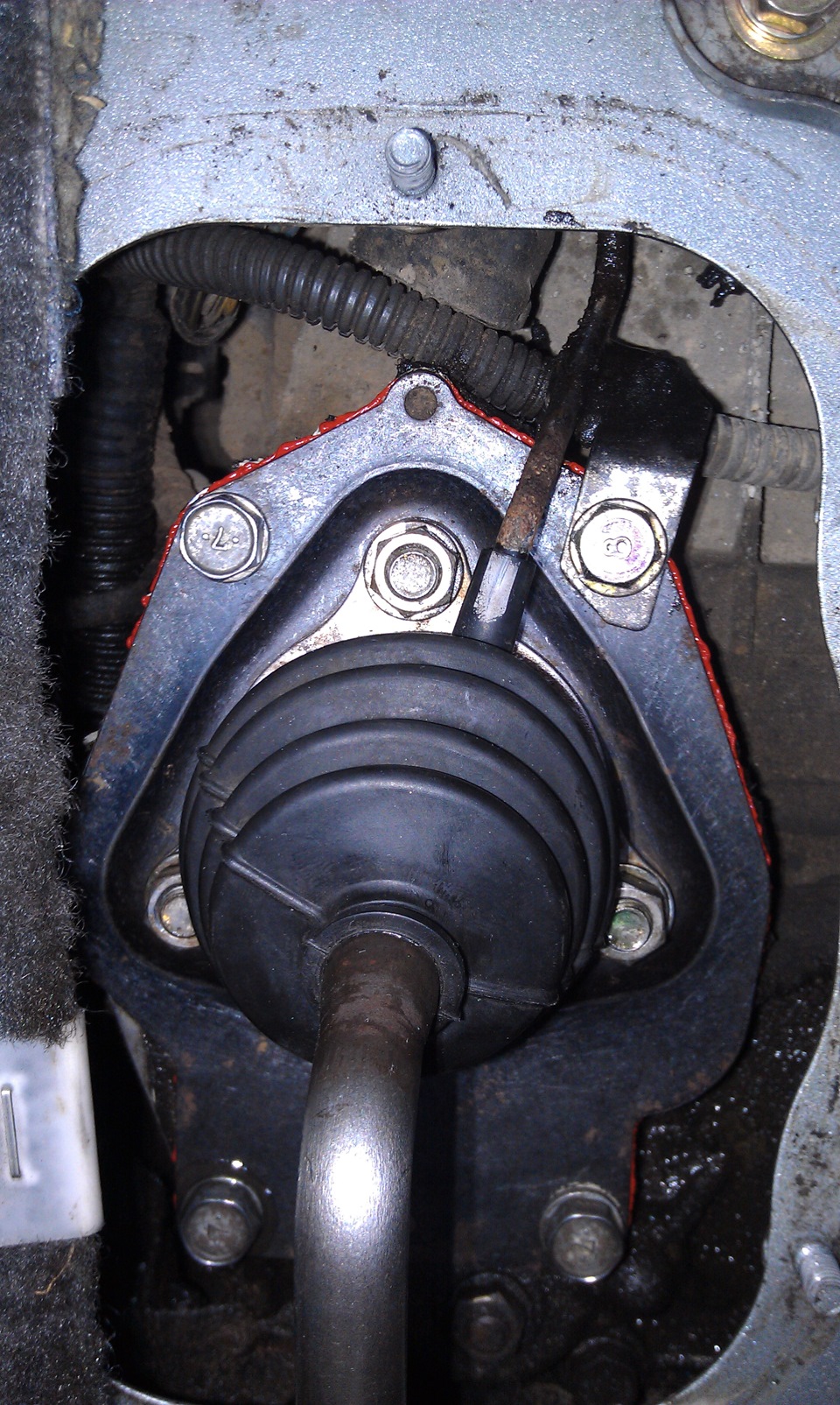 Снимаем металлическую рамку, задираем юбку ))) т.е. пыльник и выглядываем наружу. Да, да, там уже улица. Откручиваем 4 (зеленые) болта и не трогаем 3 (красных) гайки.