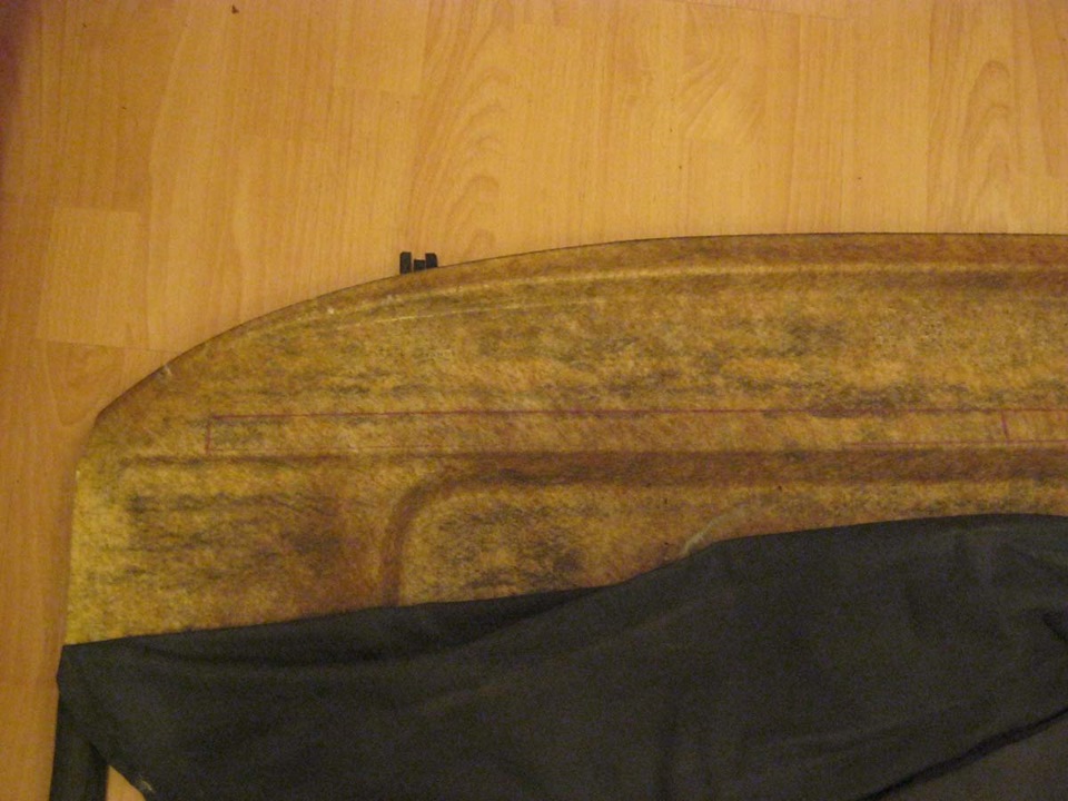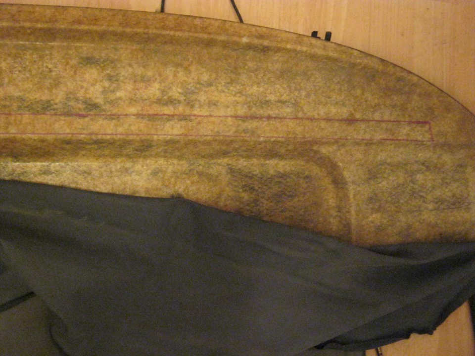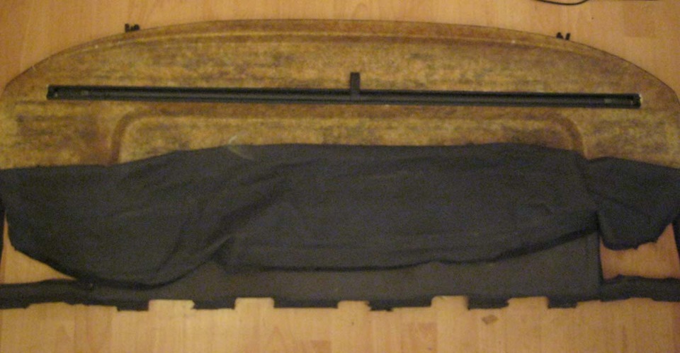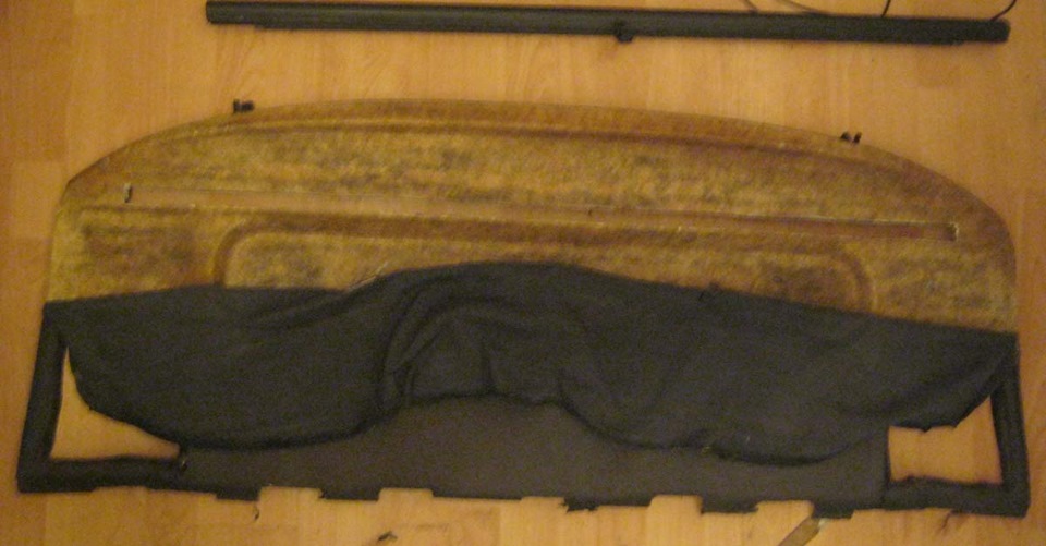 Почему? Потому что еще пару месяцев назад в надежде что когда то буду перетягивать полку я купил механическую шторку. Долго она простояла в углу ожидая свое время. И вот оно настало. Поэтому прежде чем приступить к перетяжке, я оторвал немного старого скальпа и разметил место прорези под шторку