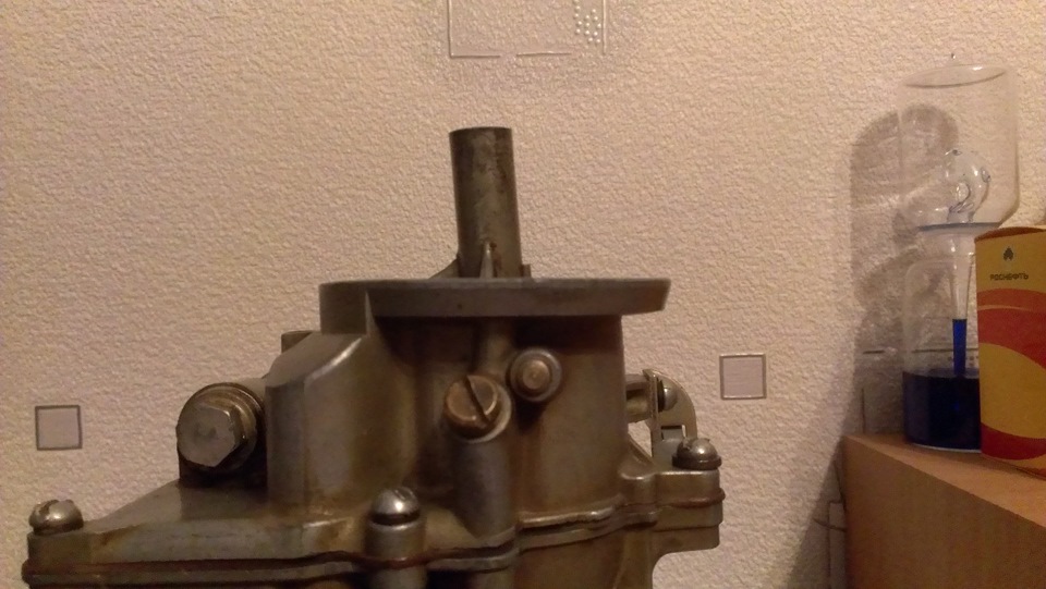 Сначала не мог понять почему же воздушная заслонка не хотела перекрывать полностью воздушную камеру. Сначала грешил что там куча нагара и поэтому подвижность крайне маленькая. Почистил, кое-как прикрыл заслонку, через немогу открутил два винтика (теперь надо новые найти), снял заслонку.