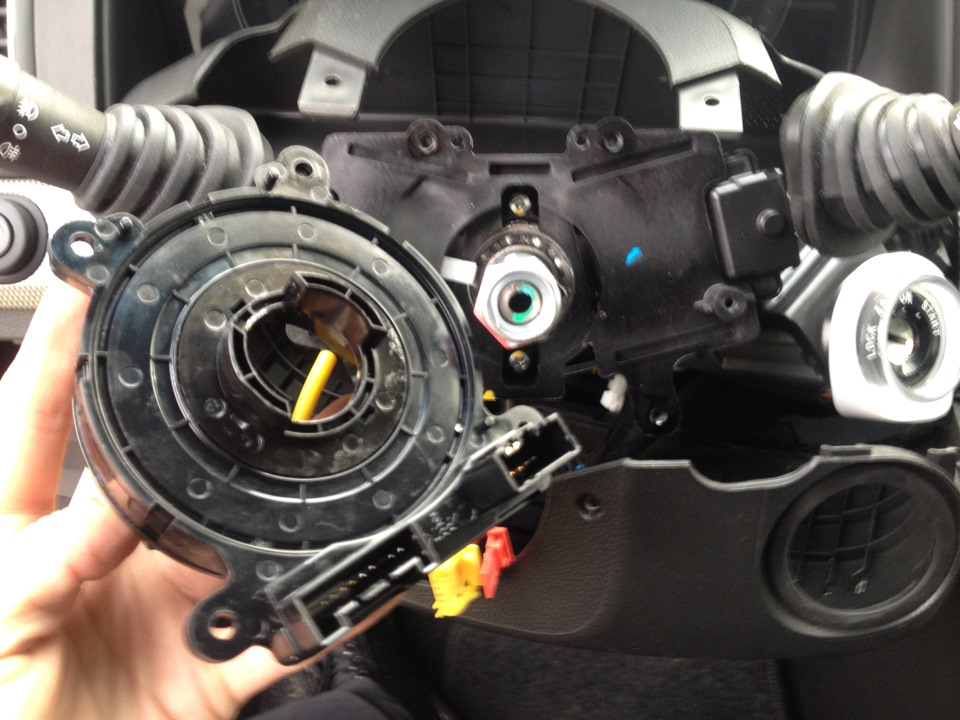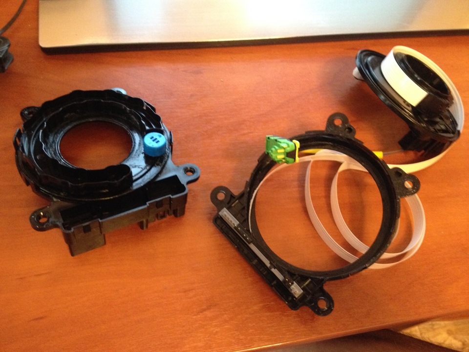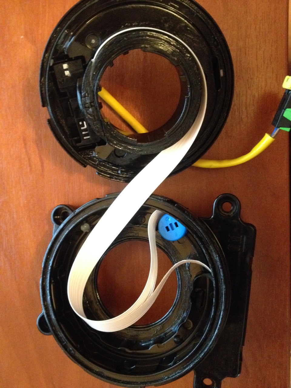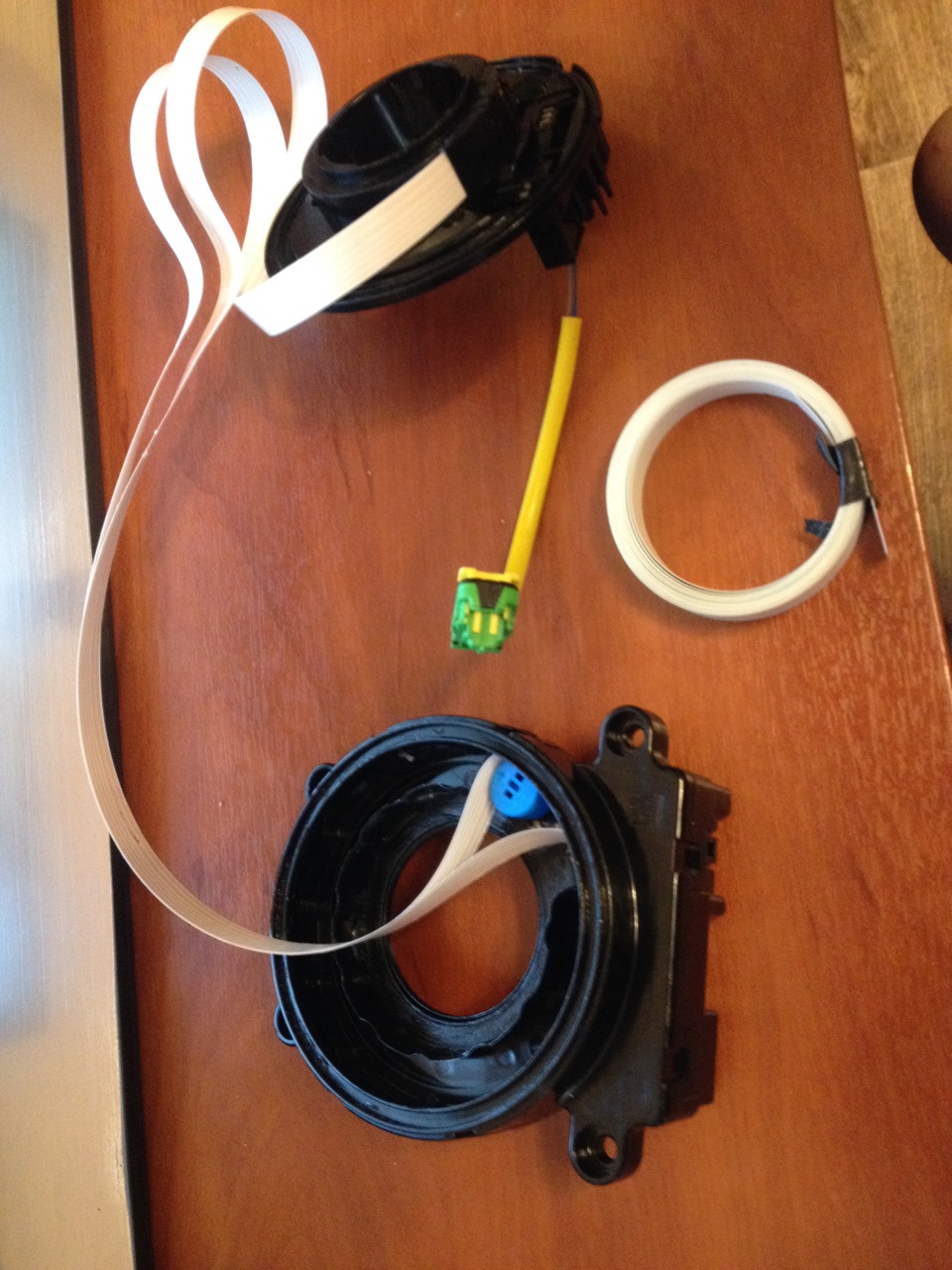 Разобрав улитку, я застал сгоревший шлейф с оправившимися перемоточными колёсиками. Мне пришлось их выкинуть, покупать похожий шлейф, и делать механизм в виде часовой пружины. Как на bmw. Ну и подпаиваться, восстанавливая работоспособность управлялки и подушки.