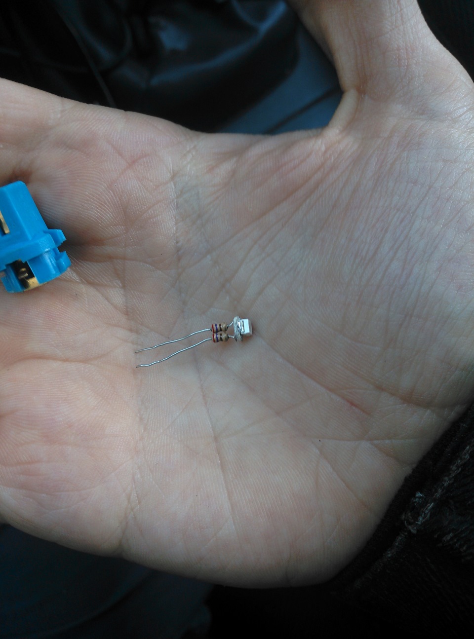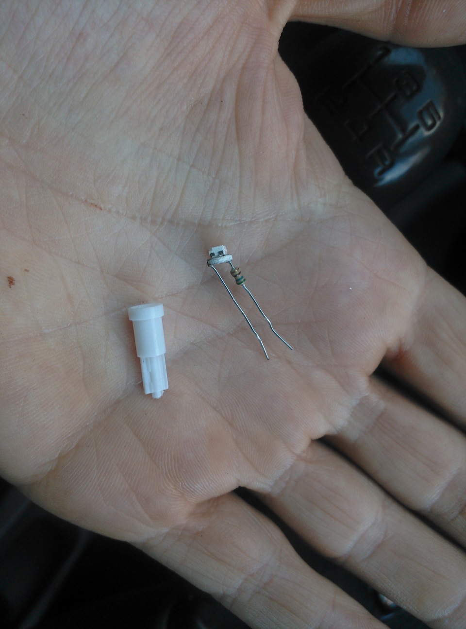 Но на этом история не заканчивается)) После того как сделал первую кнопку (кондея) вернулся к кнопке обогрева — там я ранее вставил диод, но он почему то не горел, в общем поколупался, попробовал попереставлять так и сяк — не горит. В итоге понял что диод накрылся и решил просто поставить новый. Но дело в том, что диодов я в этот раз купил ровно 4 штуки, т. к. один сломался, мне пришлось порыться в закромах родины, собственно в процессе были найдены пара таких же диодов Т5, которые я покупал раньше, еще когда эксперементировал с цветами центральной консоли. Так вот, когда я разобрал этот диод, я увидел, что у него резисторы напаяны на оба контакта О_о