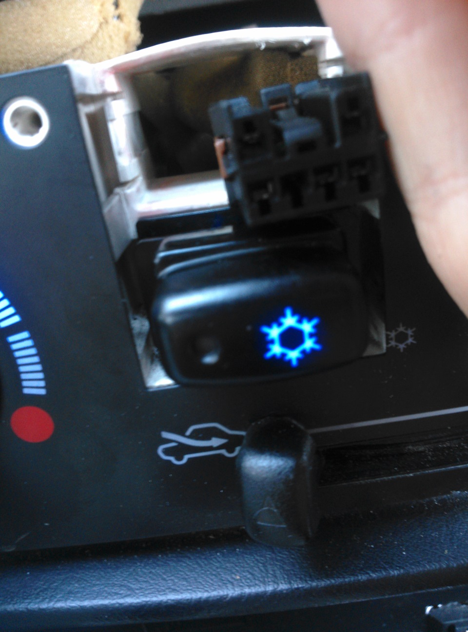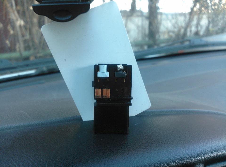 Ну, делать собственно нечего, в магазин уже не побегу снова, значит будем пихать этот. В итоге смог затолкать диод и с двумя резисторами на ножках в эту мелкую резинку =)) В этом случае угадать полярность с первого раза тоже не получилось, но тут собственно и предыдущим опытом не воспользоваться было, резисторы то теперь с обоих сторон))) В общем со второй попытки загорелась и на второй кнопке подсветка, правда как мне показалось — она светит чуть тусклее, чем кнопка кондея, хотя возможно это просто при дневном свете так кажется, вечером думаю будет виднее, когда начнет смеркаться =) Но в целом результатом доволен, думаю если разница и будет, то минимальная и опять же не общем фоне будет не видно, так что скорее всего забью — и так хорошо!