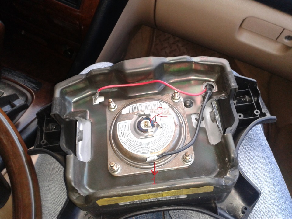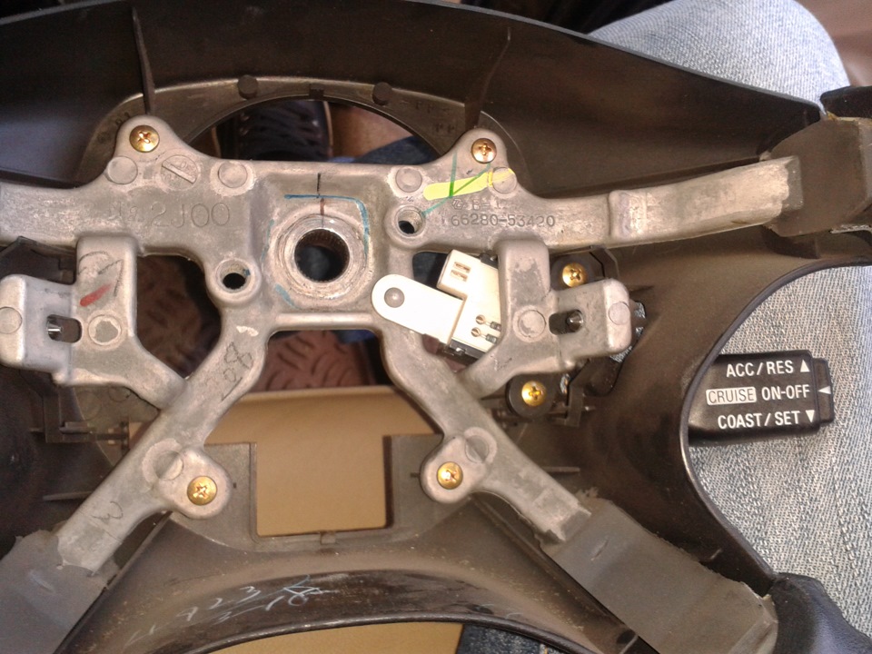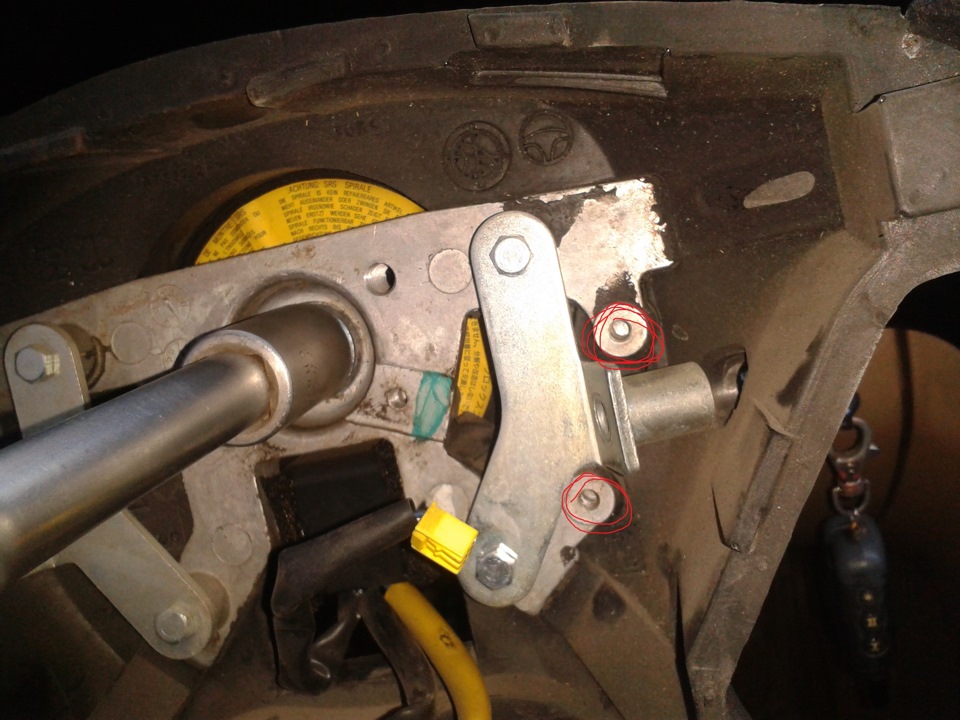 Сбоку откручиваем 2 болта и пошло дело… Черный проводок к черному, желтый к центру подушки.Руль без круиза, но поставить его не составит труда, отметил крепления под него.