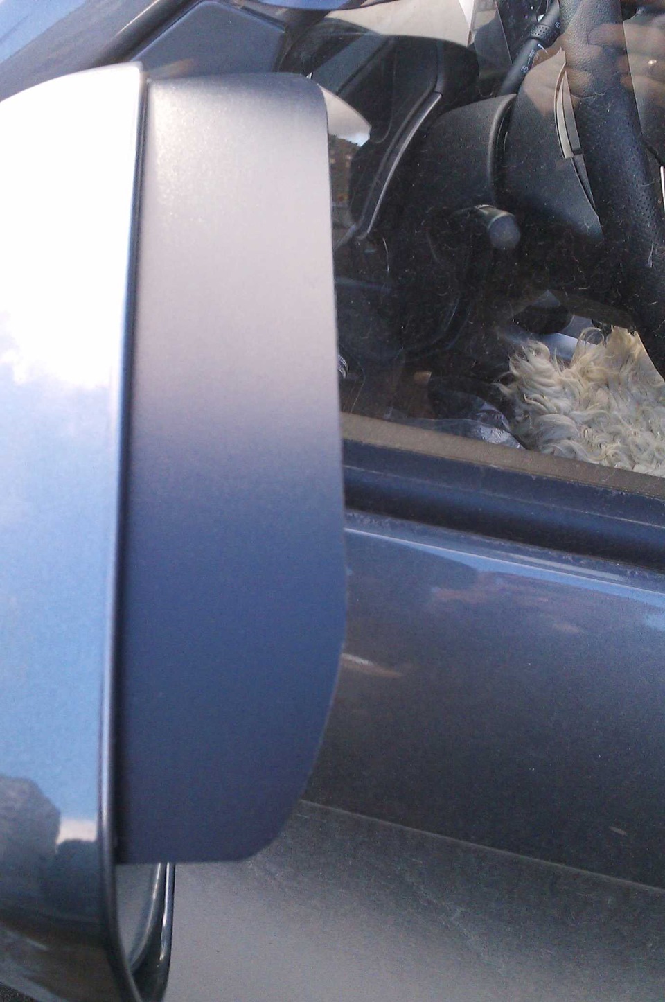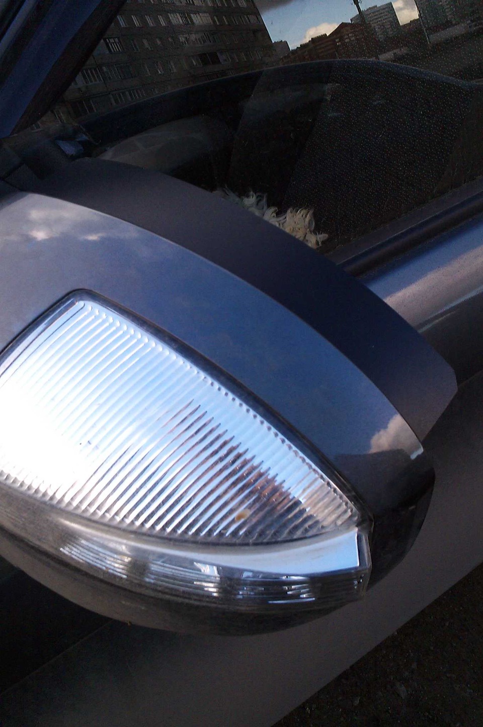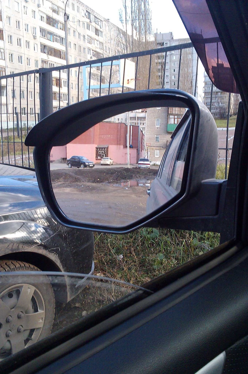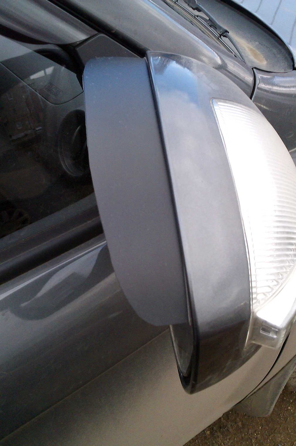 Сделал самодельные козырьки для зеркал. Лопухи у нас большие и в дождь я себя не комфортно чувствовал так как подогрева в моей компликтации нету. Решил сделать сам козырьки, сходил в магазин Планета, там нашел хорошую папку пластиковую, жесткую, черного цвета за 85руб. Сначала вырезал квадрат, на фото это видно, далее как наклеил, подрезал обычными ножницами, для округлой формы. Зеркало при ходе не цепляет, при сворачивании зеркал об окно не задевает.