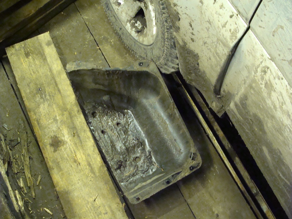 Хорошо, что поддомкратил правую сторону, чтобы до пластикового щитка у горловины добраться, а то бак имеет габариты бОльшие, чем просвет между полом гаража и порогом автомобиля. Поэтому бак вытащил на правую сторону (почти полупустой, поэтому лёгкий), оттёр его от грязи немного.