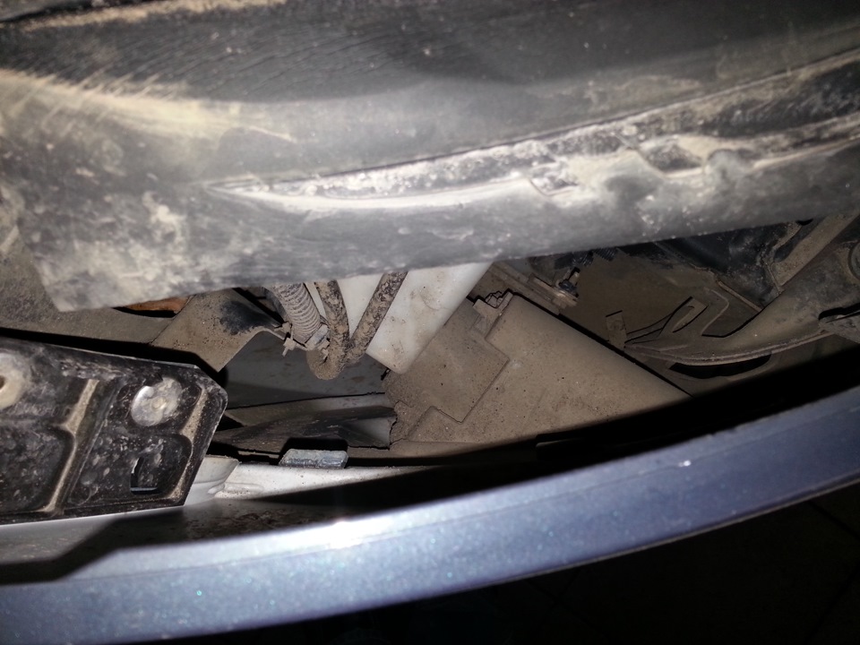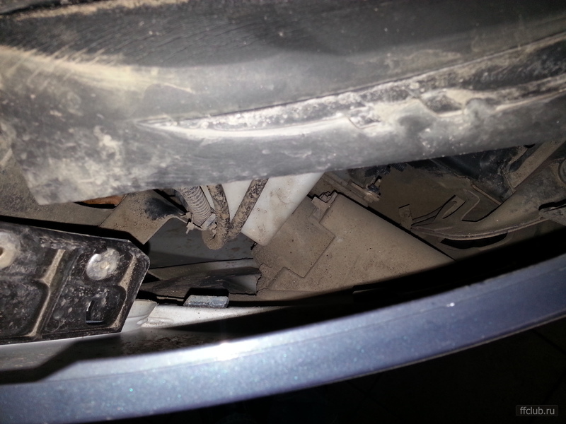 Накладки бампера в принципе можно и не снимать, т.к. крепления сделали достаточно необычно (ПТФ прикручены с обратной стороны бампера). Грязи под накладками полно, сказывается отсутствие подкрылков. :fp:
