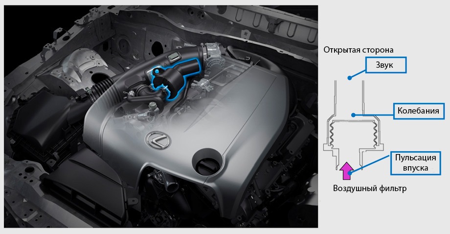 На автомобилях с «шестёркой» 2.5 тоже есть свой генератор звука — здесь это «слуховая труба» с мембраной внутри, соединяющая впускной коллектор с салоном. Результат работы действительно приятен на слух.