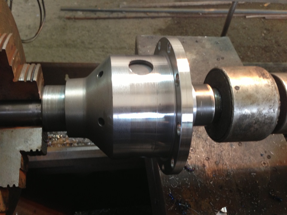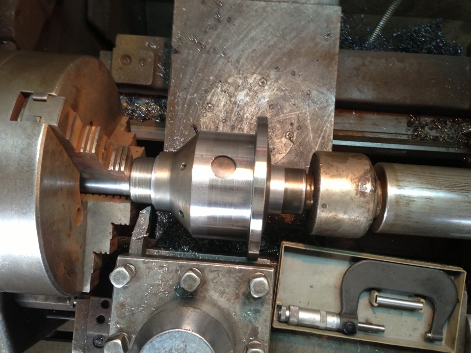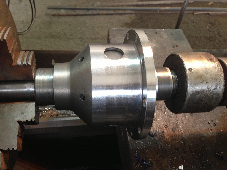 Токарь сказал что очень важно правильно зажать блокировку в центрах, от этого зависит точность и качество получаемого продукта.Деталь зажата не в патроне а в оправе, оправа сперва проточена для центрации.(ОЧЕНЬ ВАЖНО), И все токарные работы над самоблоком проводятся с одной установки, не снимая деталь с станка.