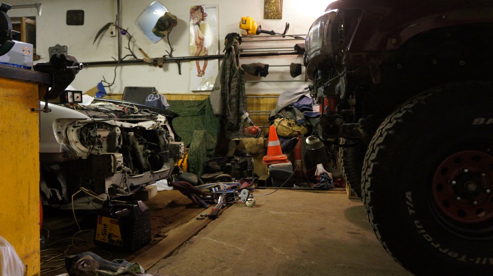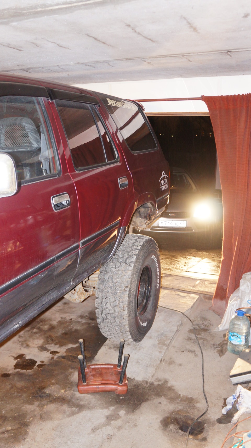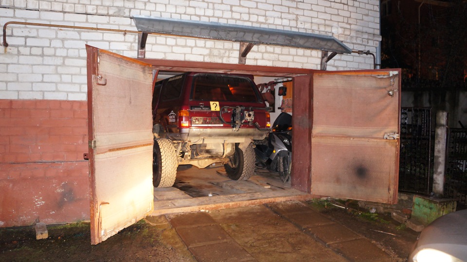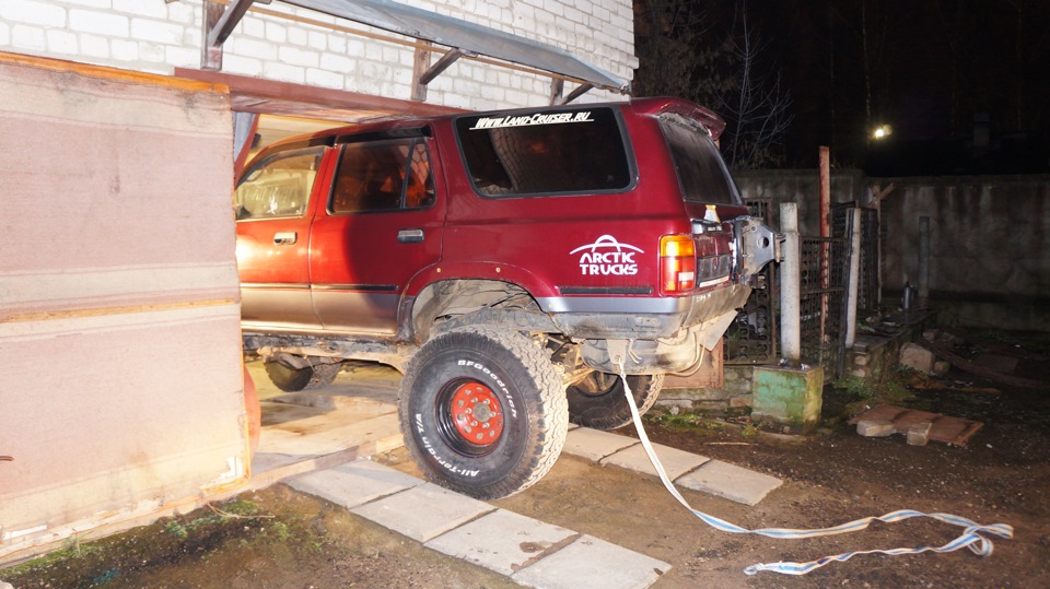 В общем проблема была во времени которого не было, через час надо было быть в другом месте))) Плюс заднее колесо из-за не самой точной подгонки авто упиралось в дверь гаража. Опять форд в помощь. Выдергиваем малыша из гаража, спускаем передние колеса, лебедкой затаскиваем половинку авто и спускаем задние колеса…тянем…ан нет, упирается крышей, сполер точно не пройдет. Накачиваем передние до 2 атм и о чудо жопа стала значительно ниже! еще 20 минут и малыш в ГАРАЖЕ! Счастливый я погнал по своим делам)))
