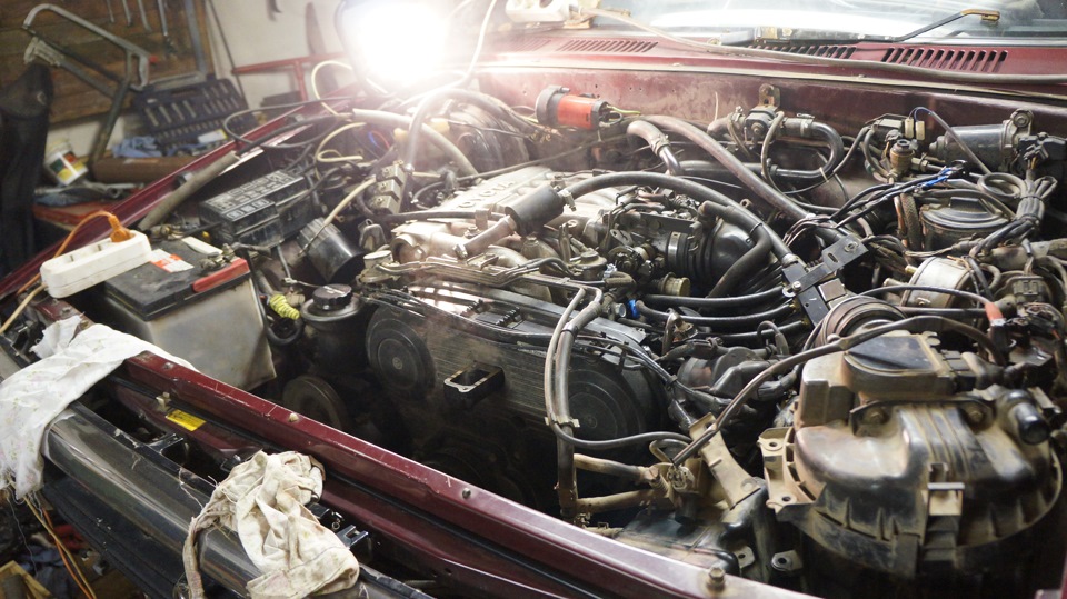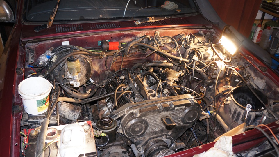 В общем дней несколько назад сурфа был загнан на половинку в гараж при помощи какойто матери, лебедки и форда))) Под капотом меня ожидал страх и ужас, сурф два дня простоял под домом без капота и лили жуткие дожди. Мотор стоит а вот все внутрености просто болтаются и что куда подключать бААльшой вопрос. Плюс не было форсунок)