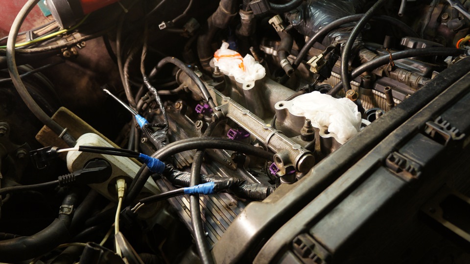 Ставим форсунки. накидываем впуск с форсункой холодного пуска. Тест топливной. Зажигание. Замыкаем нужный контакт в диагностическом разъеме…насос заработал нагнетая нужное давление…опа первый прорыв бензина. Плохо прикручена трубка на топливной рампе. Прикручиваем и протягиваем все остальные болты. Второй пуск…все сухо. отлично. Время уже под утро. А фиг с ним успею. Заливаю свежее топливо…эх как это не просто это с такой высокой горловиной, накидываю впуск, ставлю трамлер, без хомутов собираю воздухан. Ключ в замок