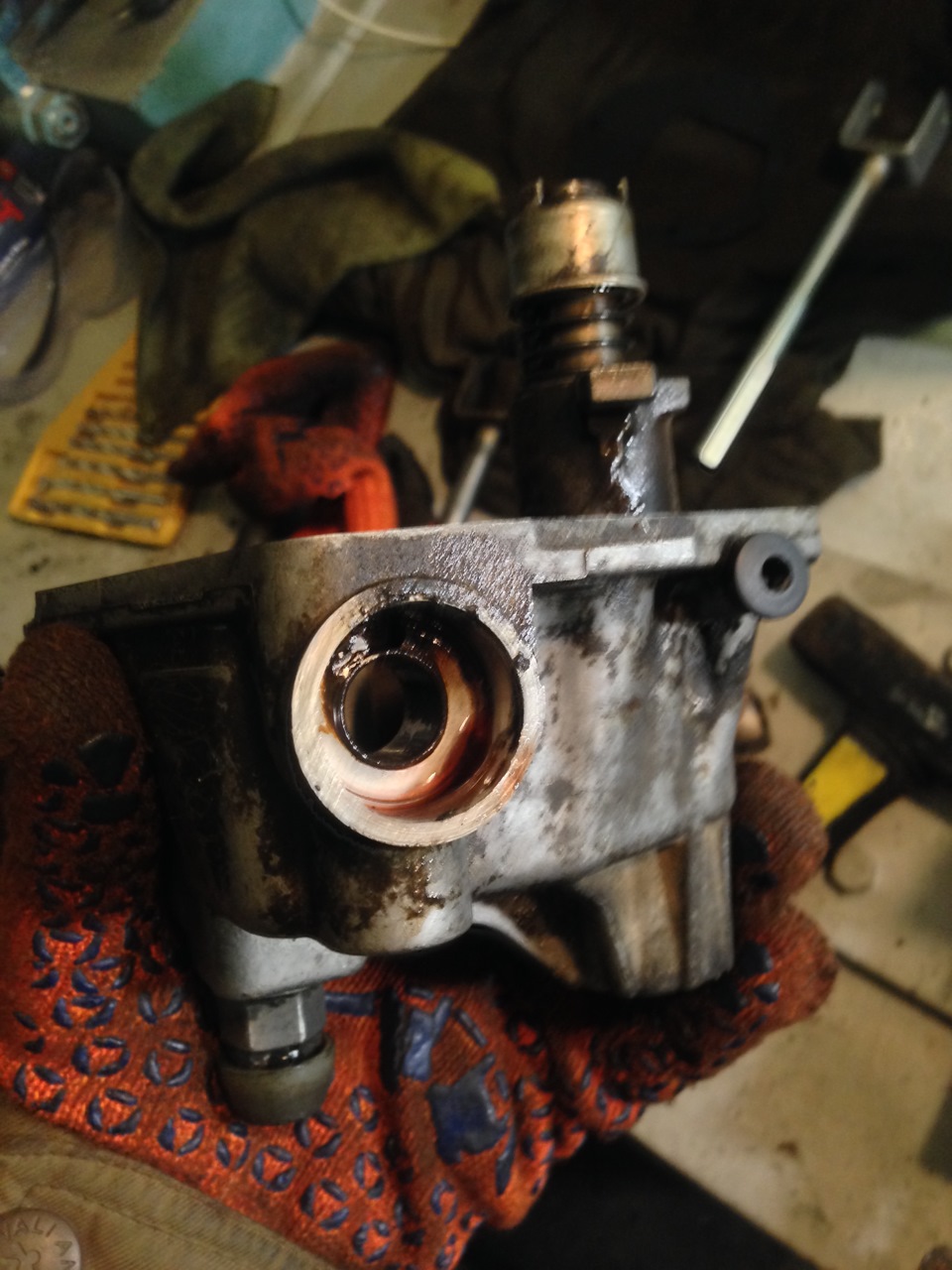 Следующим шагом выбиваем штифт, я выбивал старым сверлом на 5мм (по размеру идеально подходит) Выбивать надо "над" углублением сапуна, иначе штифт упрется в стенку и будет не смешно, т.к. забить обратно его будет проблематично…