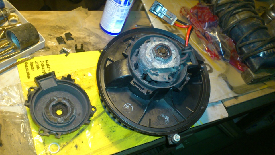 С дверями разобрались, принимаемся за моторчик печки… Что то по утрам начал издавать мой моторчик непонятные звуки, как будто приходит конец подшипничкам. проявлялось это в основном на низких скоростях, при повышении скорости вентилятора звук пропадал… В пятницу вечером после работы этот звук ввиде скрежета стал сильным и проявлялся на любых скоростях… честно напрягать стало конкретно, думаю хорошо что выходные впереди как раз и разберусь.