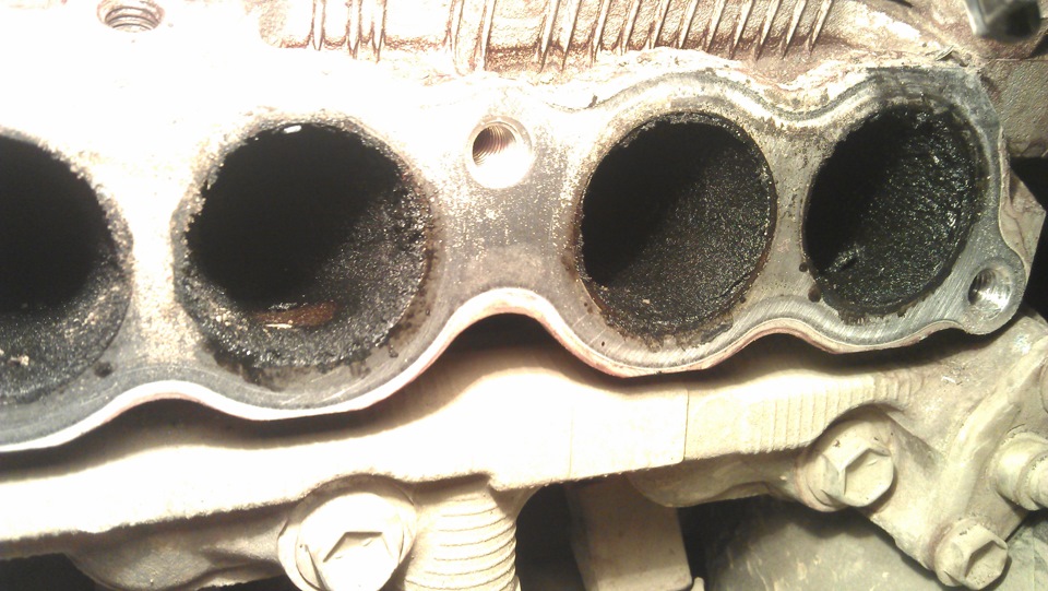 Немного раскидали верх, сняли все пластиковые крышечки, воздухан, ремень генератора, отсоединили радиатор.Идем далее! Снимаем впускной коллектор, он состоит из трех частей.Сняли последнее колено и начали слегка ужасаться! Там где должна быть чистота, было полно масла, поступает оно туда ввиду того, что на моторе присутствует система EGR, которая возвращает выхлопные газы обратно в подачу воздуха, за экологию Японцы очень борются.Далее приступаем к снятию головки блока цилиндров, и начинаем ее со снятия инжекторов. Пожалуй это самый напряженный момент! Нас предупреждали что они очень хрупкие, но чтоб на столько мы и подумать не могли! Ребята, если будете проделывать эту процедуру будьте крайне осторожны, ломаются они просто как хлеб, а именно отламывается место крепления фишки на инжекторе, а там обмотка как на катушках из проволоки медной, припаяться не получится. Инжектор вещь очень не дешевая, а проблематичней всего ее вообще найти на разборках.Нагар на инжекторах тоже был не плохой, но он легко снимается растворителем.Снимаем крышку клапанов, здесь все достаточно чисто, в принципе грязи особой там взяться неоткуда, ибо масло (при его расходе перед ремонтом) в моторе всегда было свежее.Снимаем распредвалы, выкладываем на газетку СТРОГО в той последовательности как они и стояли. Обязательно в шестерню распредвала перед снятием, необходимо вкрутить болт, иначе они разъедуться и будет жопа.Снимаем головку.На поршнях был заметный слой кокса, но что мы увидели на утро…Видимо в виду изменений условий окружающей среды основная грязь с поршней начала отслаиваться.Ужас! Эти слои изменяют объем камеры сгорания, а это одна из причин детонации.Блок было решено не трогать, а снимать поршни через поддон. Машина полноприводная, а следовательно для того, чтоб снять поддон пришлось раскидать всю переднюю ходовку.Пока Димон раскидывал ходовку, я приступил к мытью головки, дело вам скажу очень муторное!Поршни сняты. Проперся я конечно основательно отметив два поршня одним и тем же номером))) Но методом дедукции, восстановили какой от куда))) Повнимательней в этом моменте!Клапаны тоже были очень грязные, саепался я их скаблить, очень плотный на них кокс!