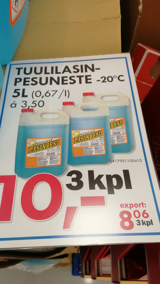 Вывод: однозначно брать и в больших количествах. За границей Валимаа находится магазин RajaMarket, в нем омывайки этой прудом пруди и на 20 и на 50. Советую заехать на обратно пути из Ф. Упаковка на 5 литров, а стоит по российским меркам копейки.