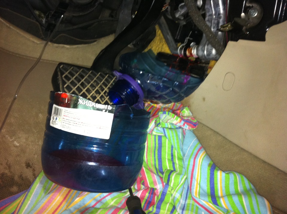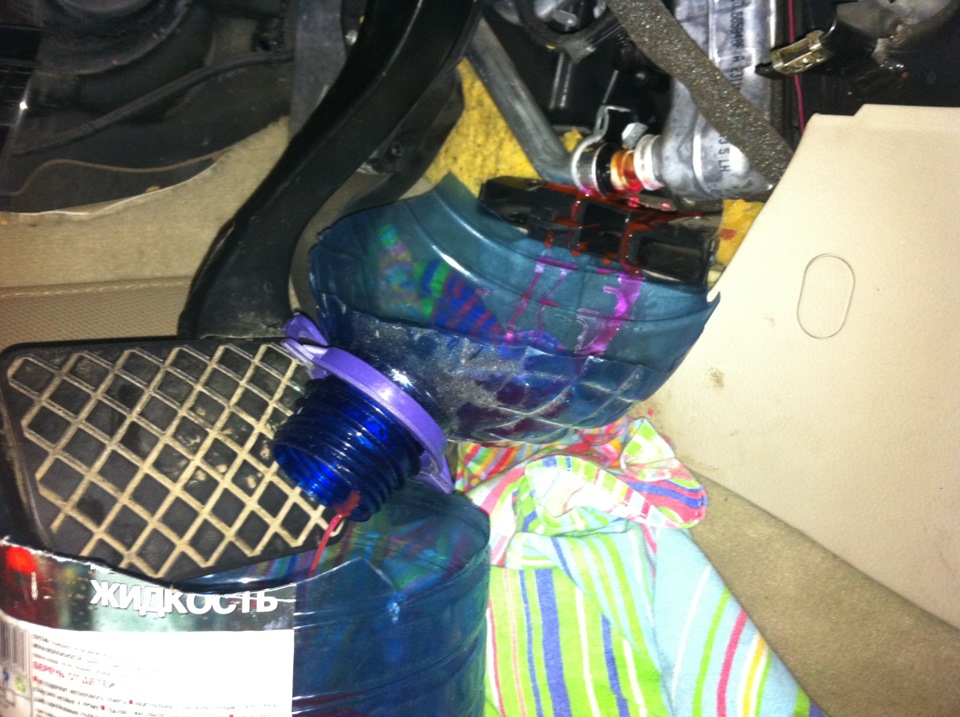 Для того, чтоб не загадить антифризом салон авто, постелил на пол старую простынь и соорудил конструкцию))