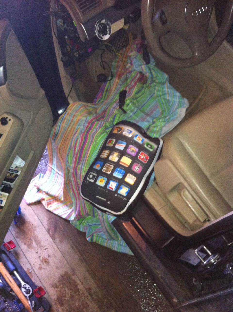 А, вот мое рабочее место в момент замены радиатора)) подушка для удобства, а то ребрами на пороге неприятно лежать))))
