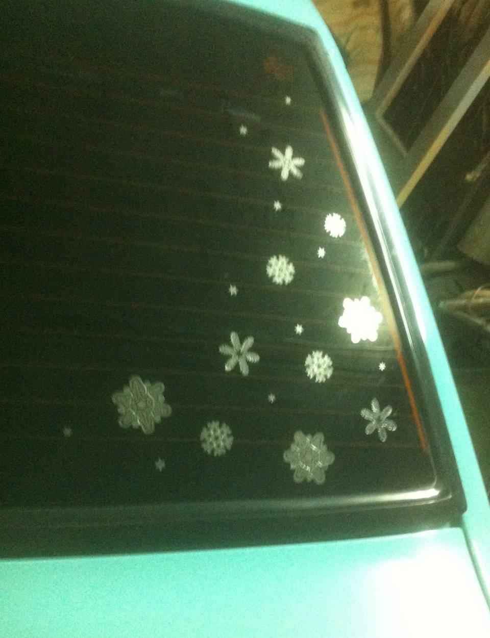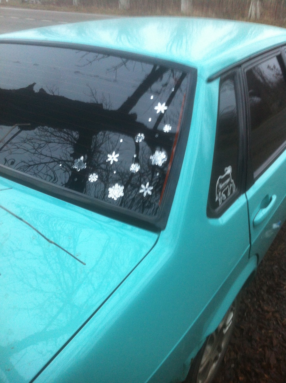 По сложившейся годами традиции, создать новогоднее настроение хочется и совершенно незнакомым людям, тем более самому радостнее становится. Делаю это как всегда через заднее стекло своего автомобиля. В этом году его украшают новогодние снежинки.
