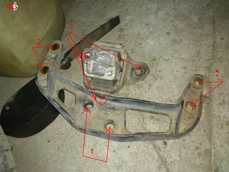 8. Ослабляем шпильки (Ф3 .1) 2 шт, и гайки (Ф3 .2) 4 шт, правой опоры двигателя ! ПРОВЕРЯЕМ УСТОЙЧИВОСТЬ ДВИГАТЕЛЯ НА ДОМКРАТЕ! Если все нормально откручиваем их и снимаем кронштейн опоры.