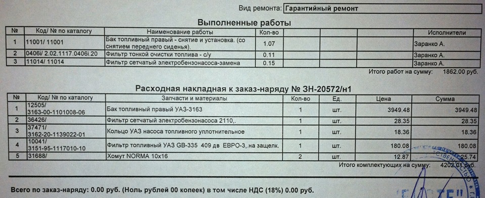 Получив на руки заказ-наряд увидел, что опять поменяли фильтр и кольцо, но цены там стояли видимо внутренние и стоят они не 214, а 47 рублей… = ))