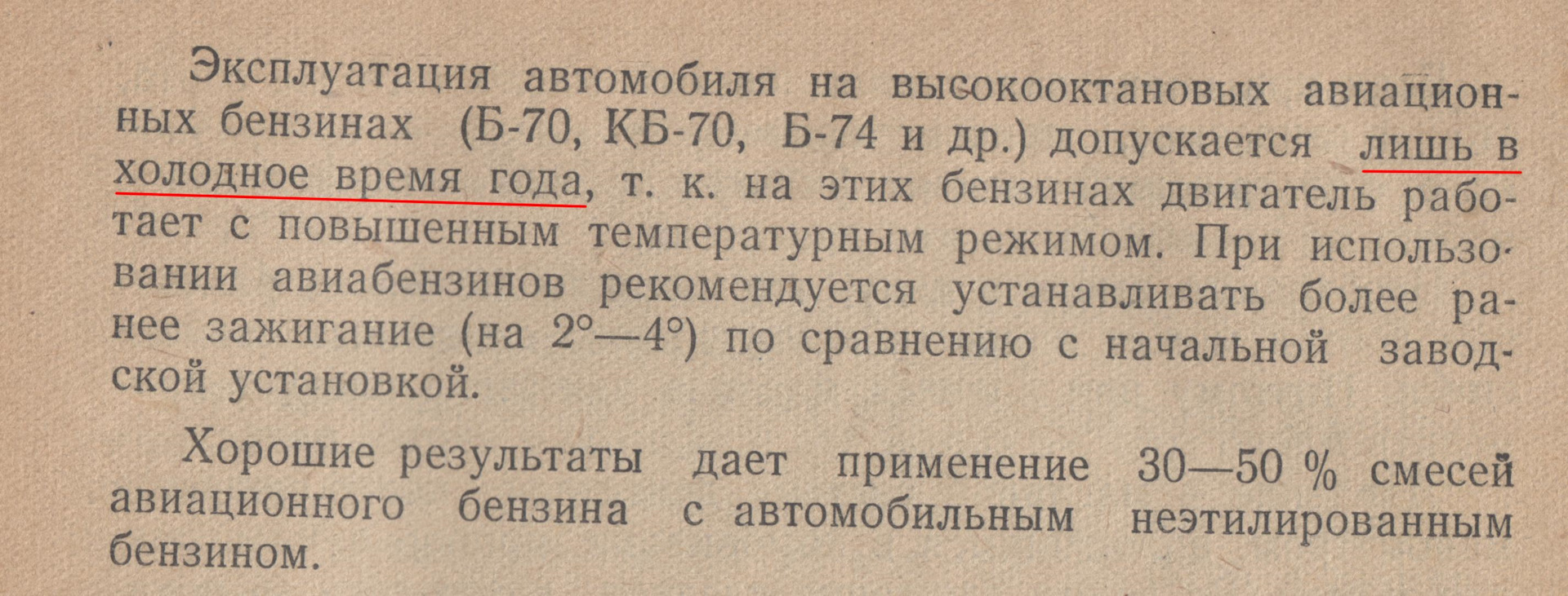Но всё равно инструкция 1955 года советует по возможности разбавлять высокооктановый бензин обычным А-66 на 30-50%.