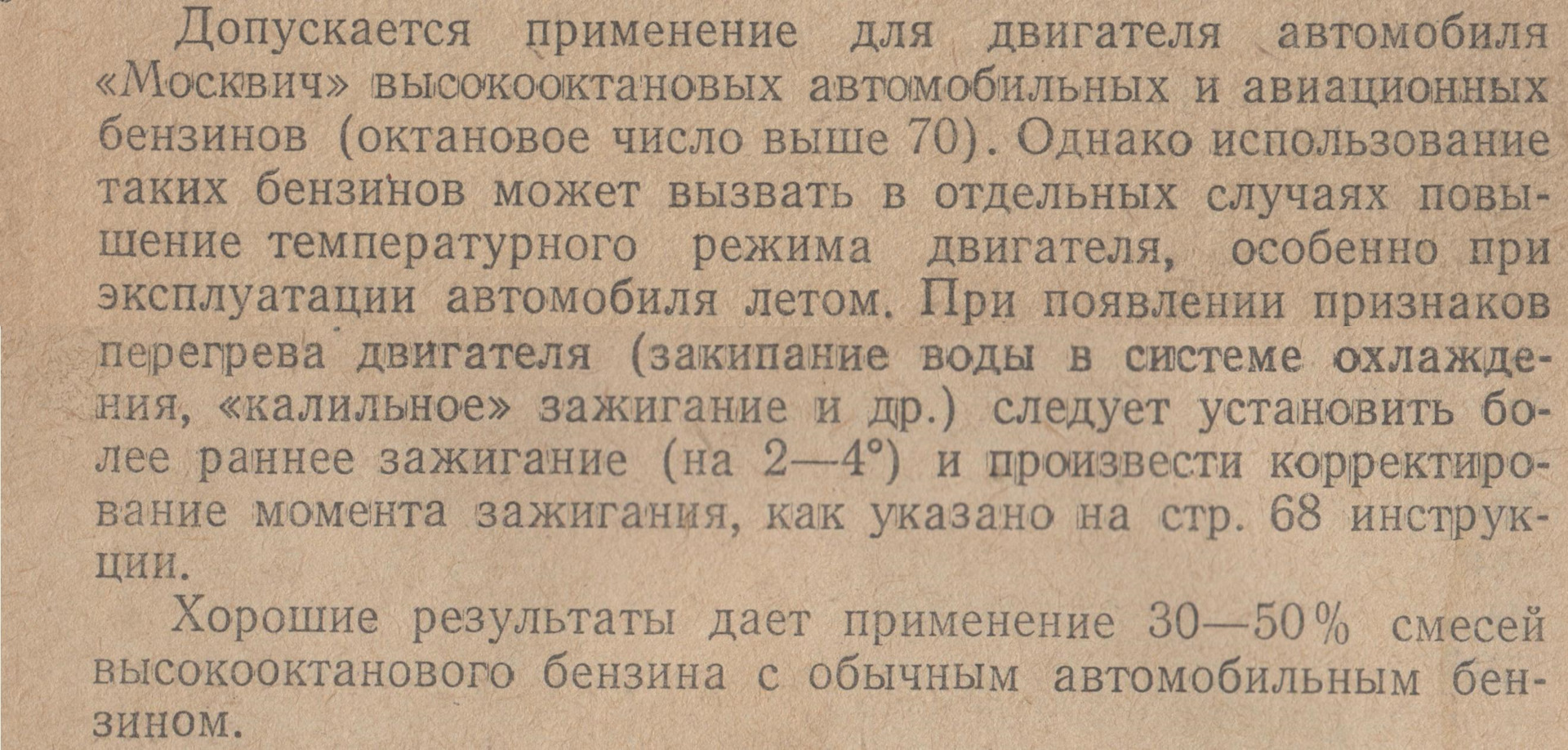 Основная проблема при использовании высокооктанового бензина в наших Москвичах-401 в инструкции по эксплуатации обозначена как перегрев двигателя.
