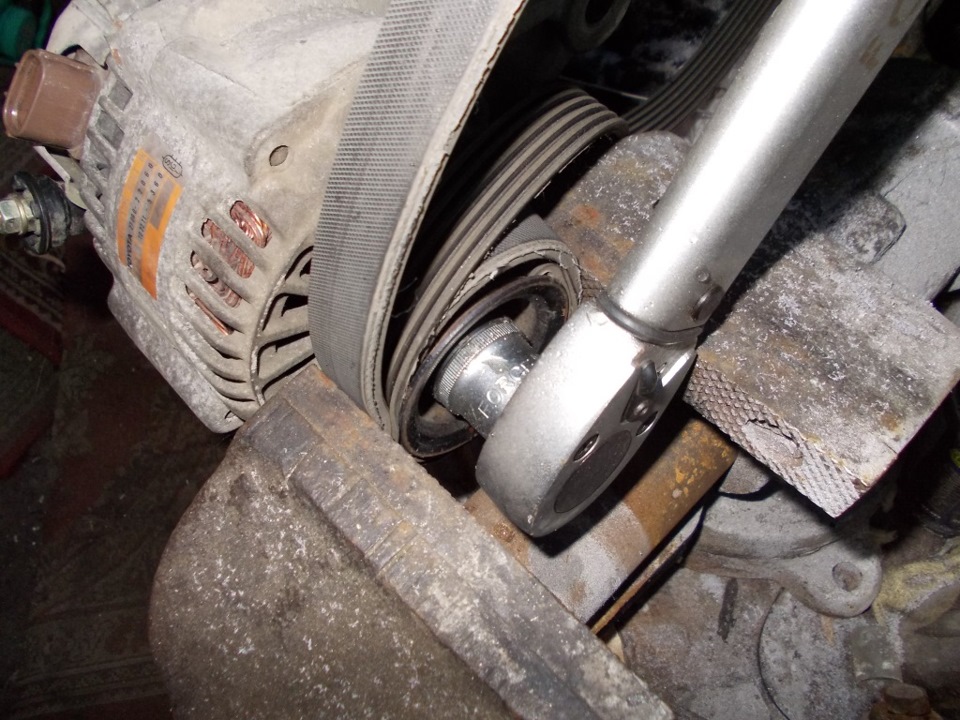 Вполне получилось затянуть удерживая шкив в тисках старым ремнём навесных агрегатов: