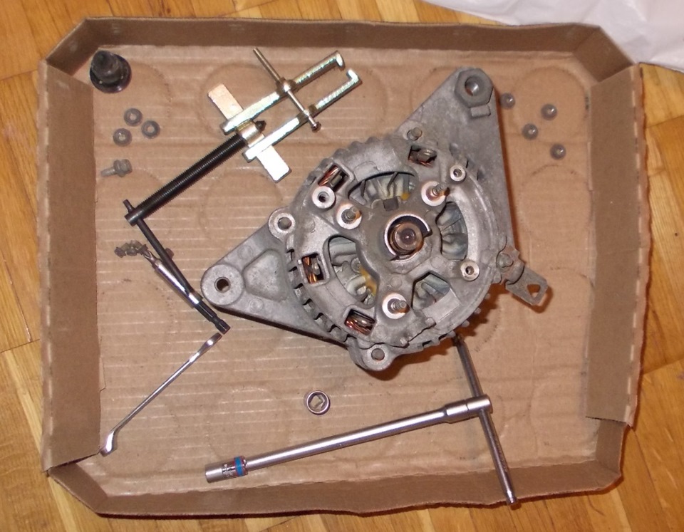 Разбирая первый раз генератор я, прочитав мурзилку, пытался открутить гайку шкива накидным ключом, держа головкой сам шкив. Но только слизал грани на шкиве. Сходил в автосервис и там мне в момент открутили эту гайку пневмогайковёртом. Во второй ремонт я уже отнёс генератор для откручивания гайки в ближайший шиномонтаж – у них тоже был пневмогайковёрт. В тот момент переобували Кукурузер, у которого колёсные гайки на 22 – мимоходом и мне гайку открутили, даже не меняя головку, т.к. гайка на шкиве тоже на 22 мм. ;-)))