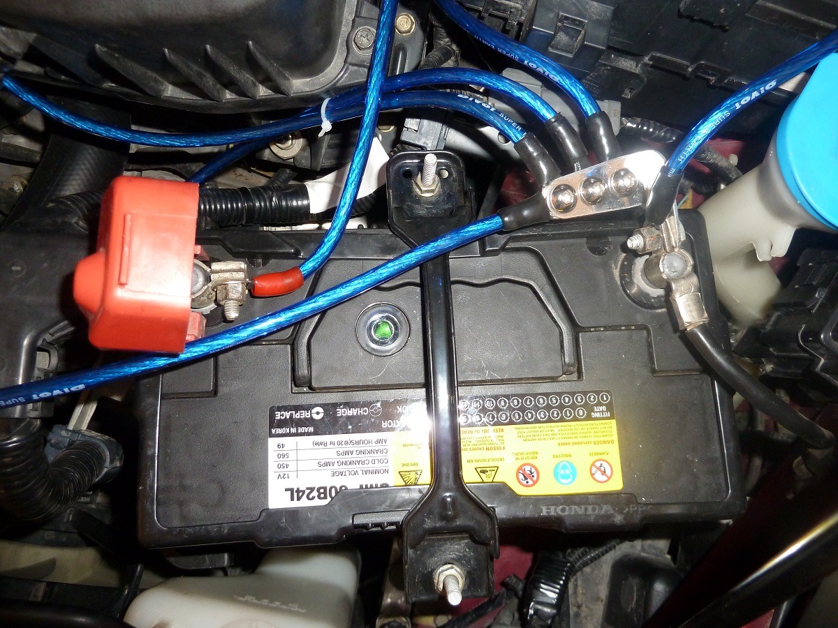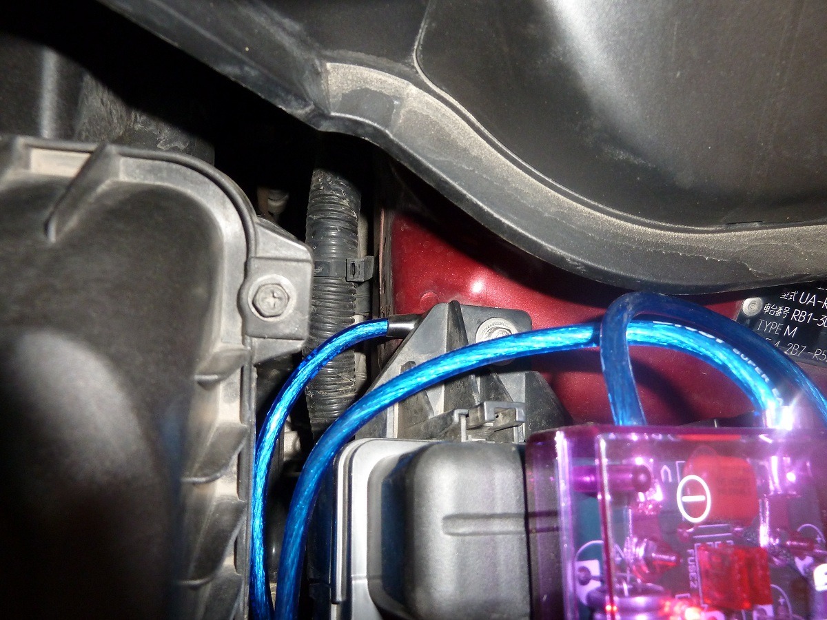 -снимаем крышку двигателя и воздушного фильтра. На минусовую клему одеваем клему для разминусовки и минусовую клему от стабилизатора.